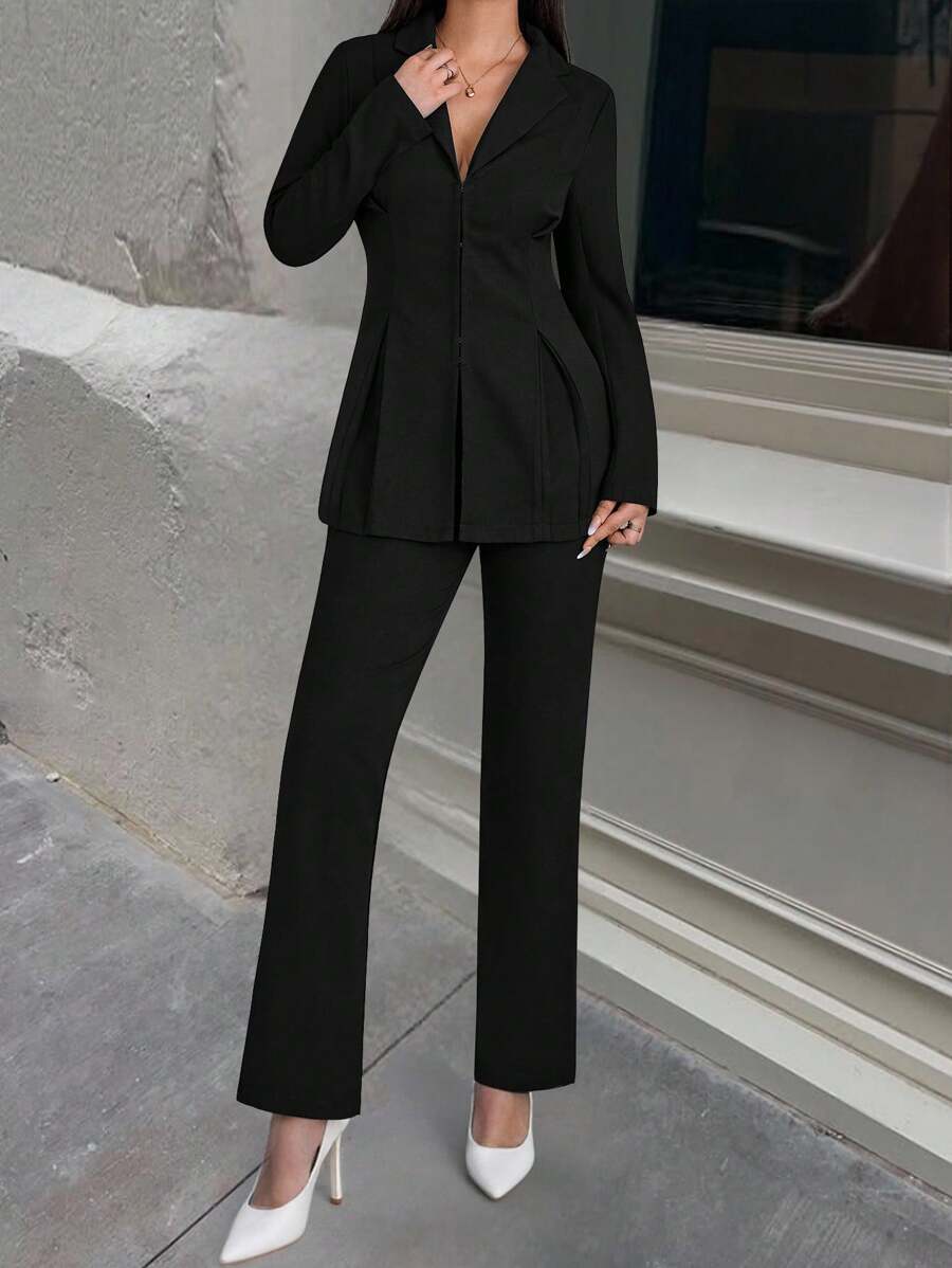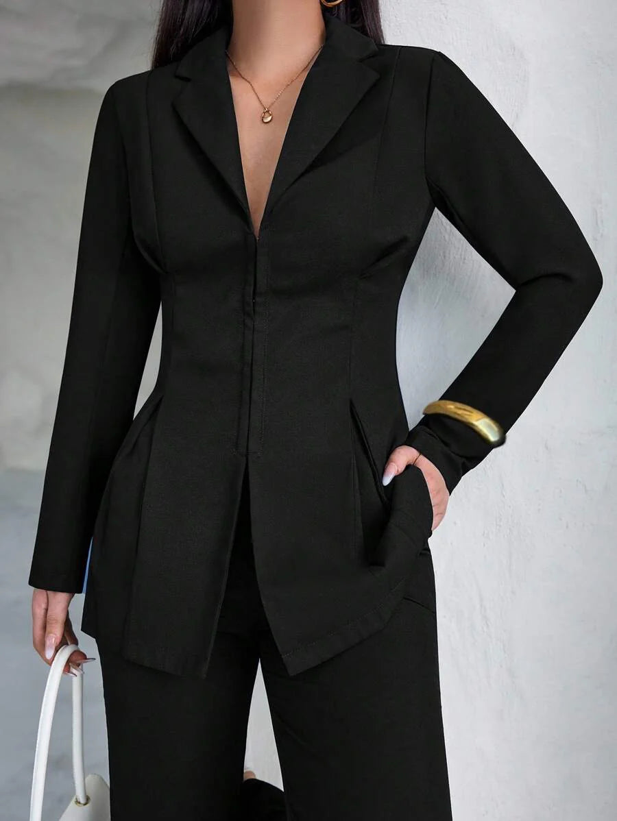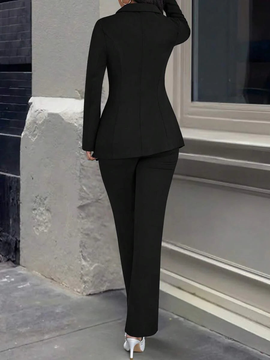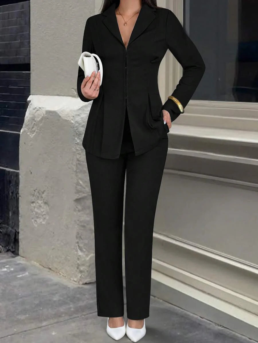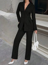 Set da 2 pezzi per donne, composto da blusa a maniche lunghe con colletto piatto di colore unito e pantaloni casual