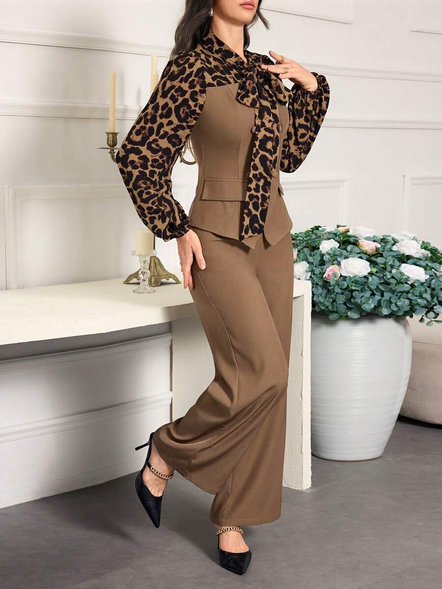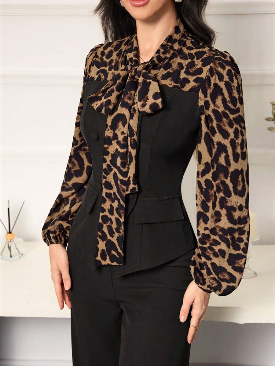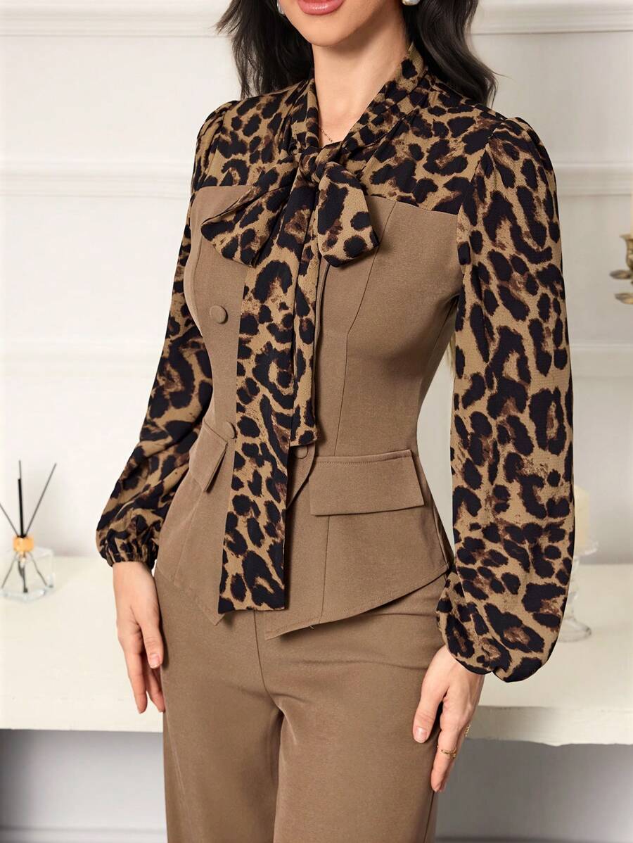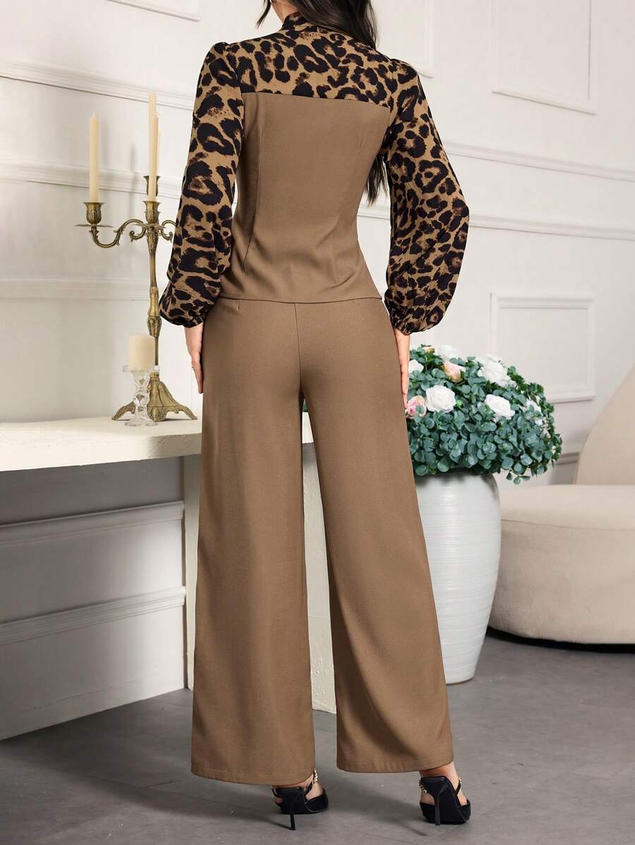 2 pezzi Set Top e pantaloni da donna con maniche a sbuffo colletto a fiocco e stampa leopardata