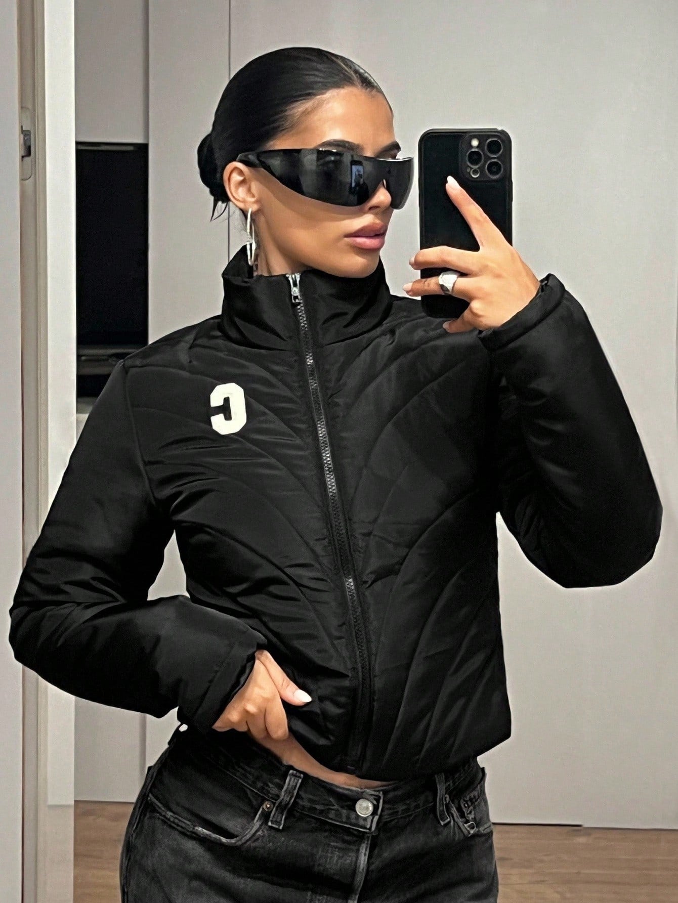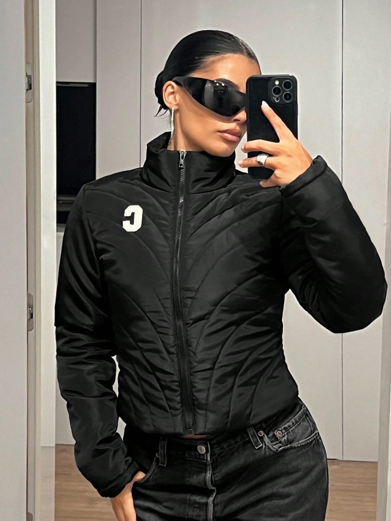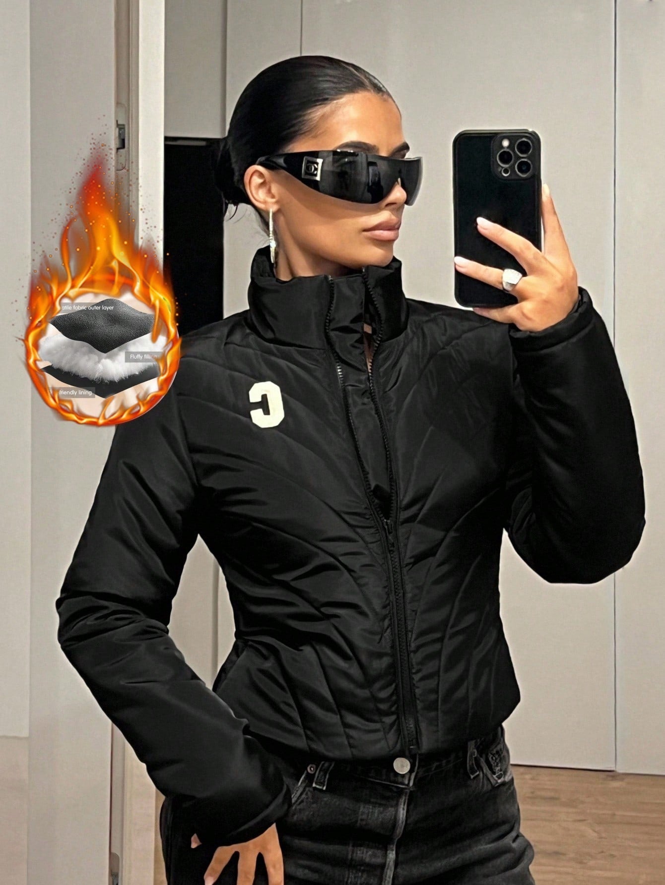 Cappotto imbottito da donna, slim fit, sexy, nero, con decorazione a righe trapuntate