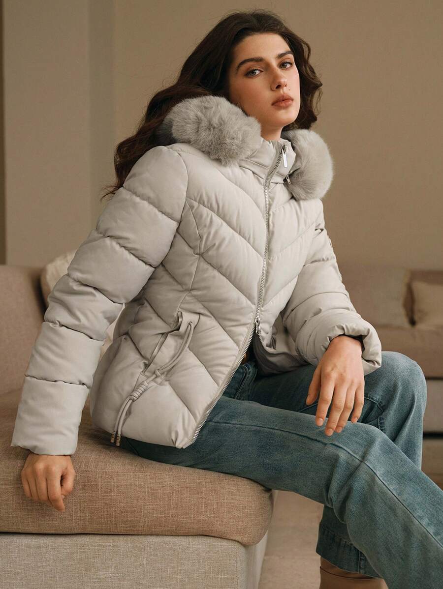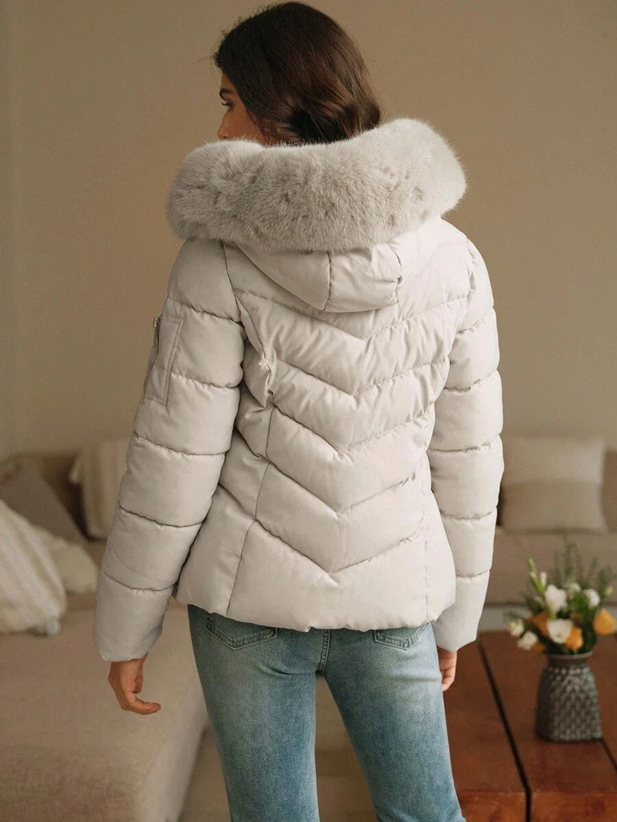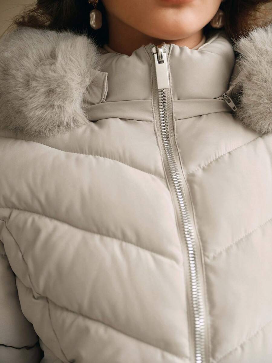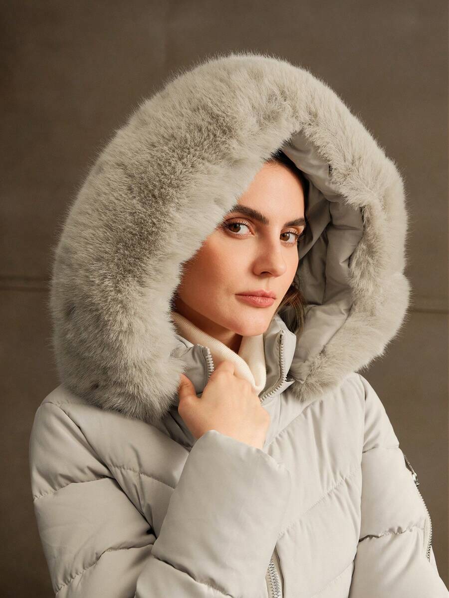 Cappotto imbottito invernale da donna con cappuccio in pelliccia, colletto con zip, manica lunga, in tinta unita