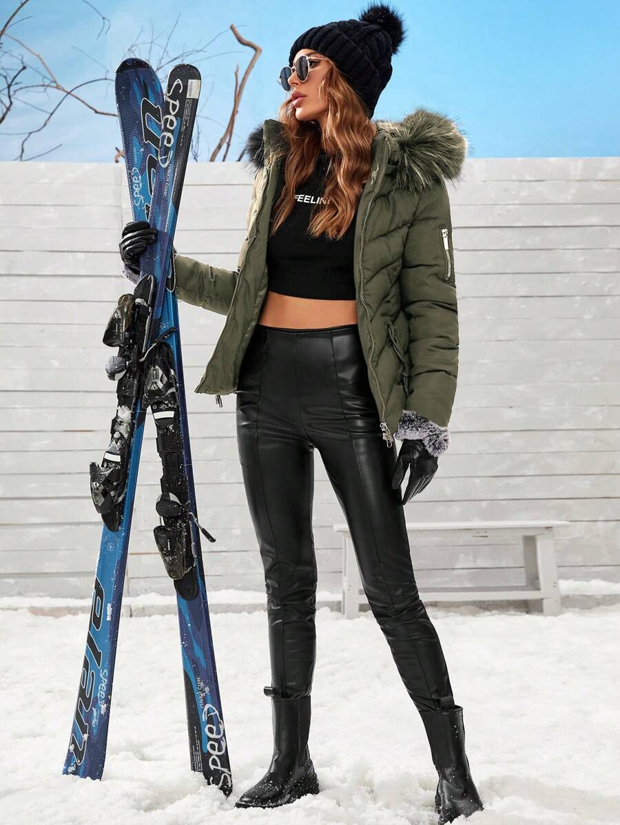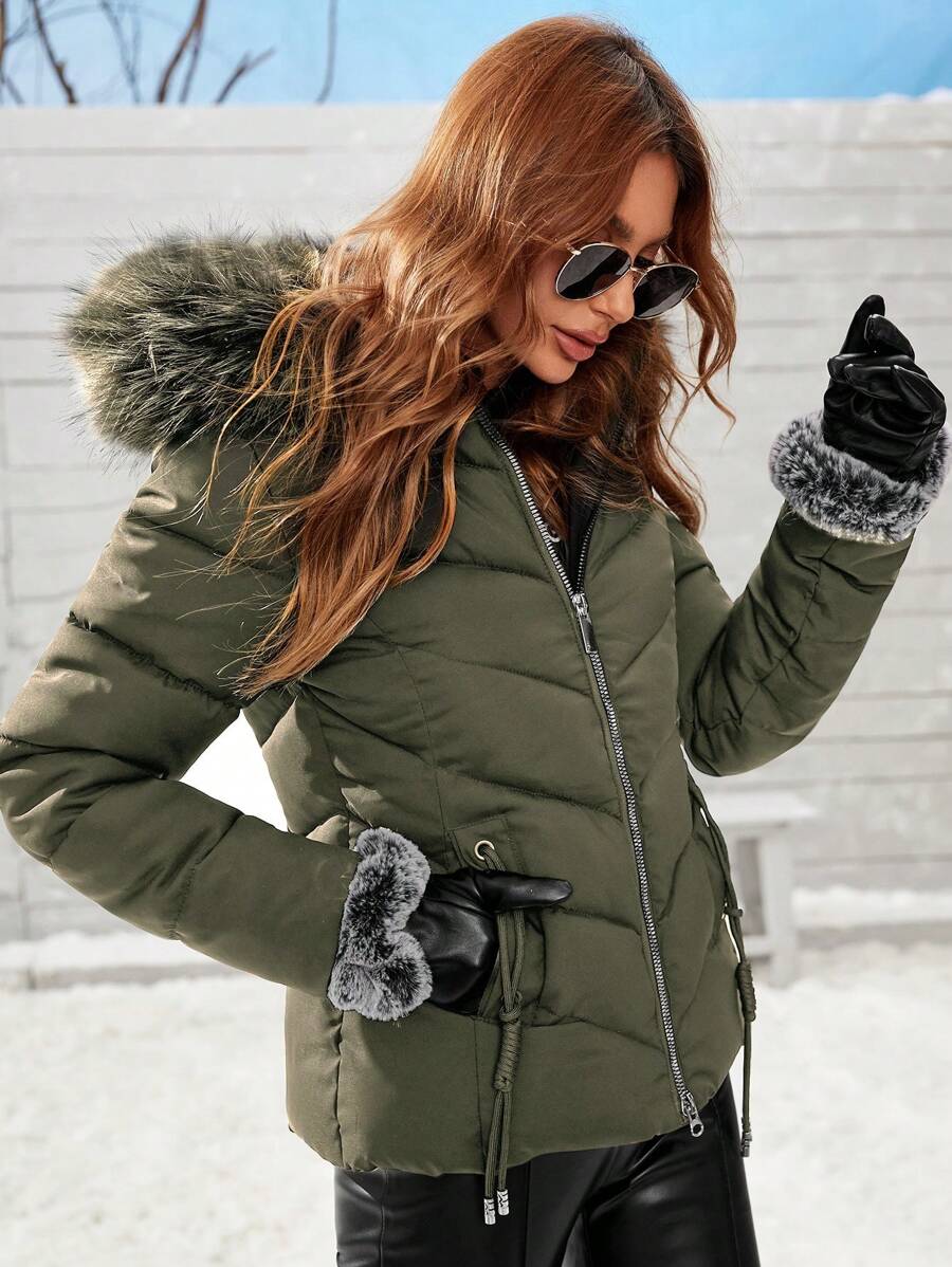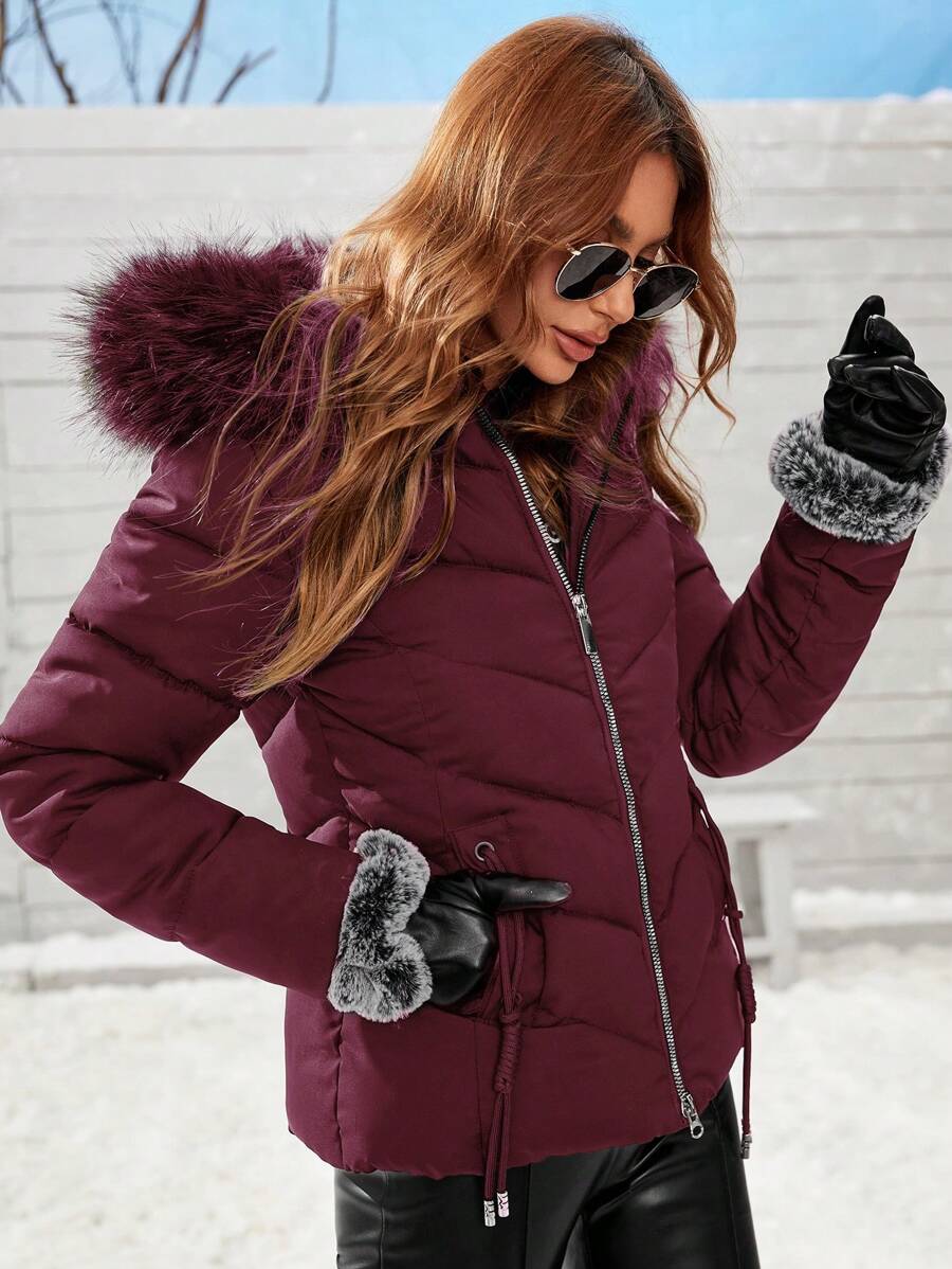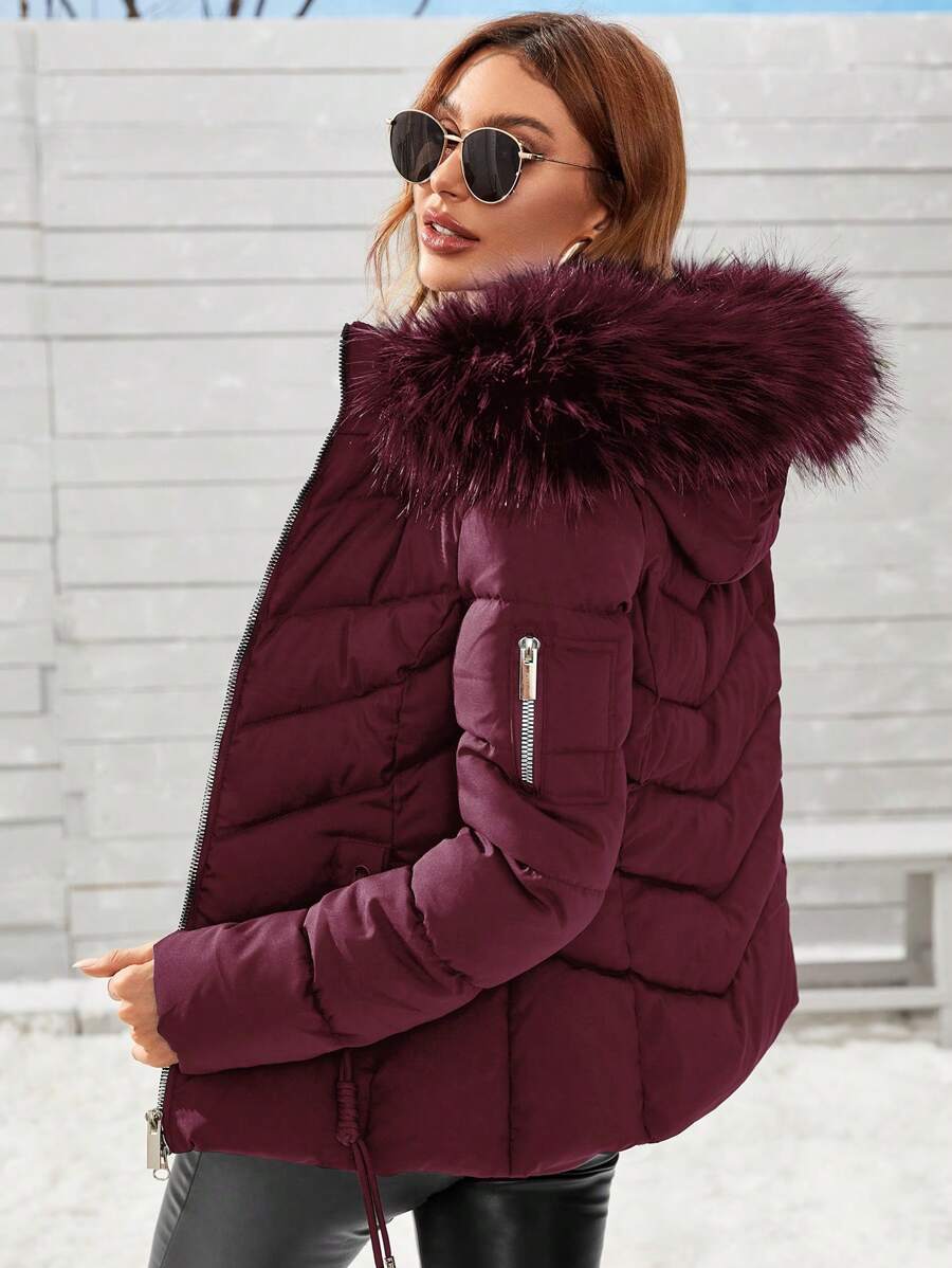 Cappotto imbottito invernale da donna con cappuccio in pelliccia, colletto con zip, manica lunga, in tinta unita