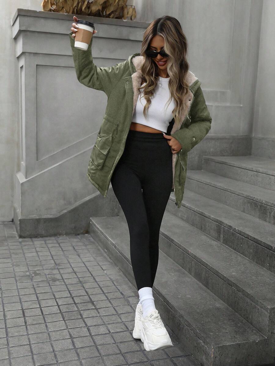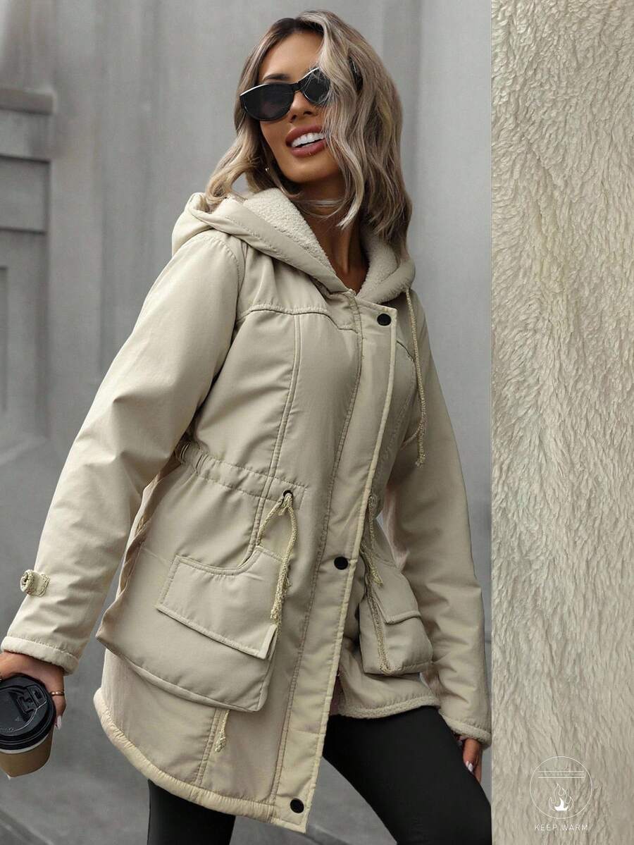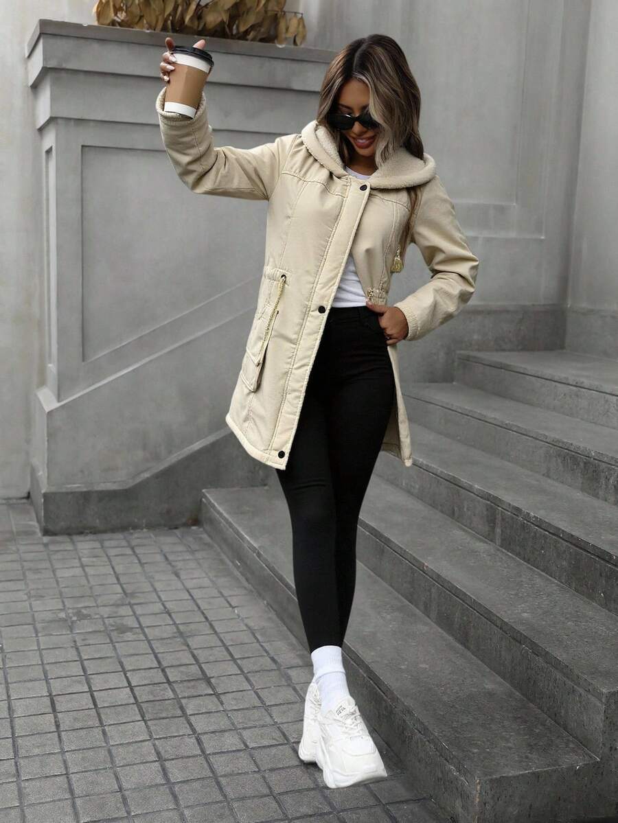 Cappotto invernale alla moda, ampio e casual, con cappuccio, con chiusura lampo e coulisse in vita, imbottito