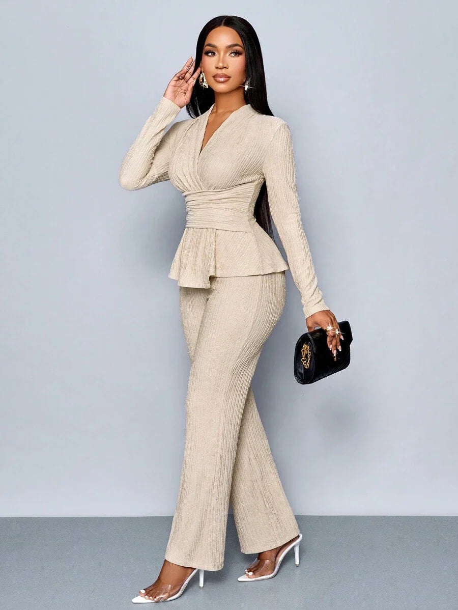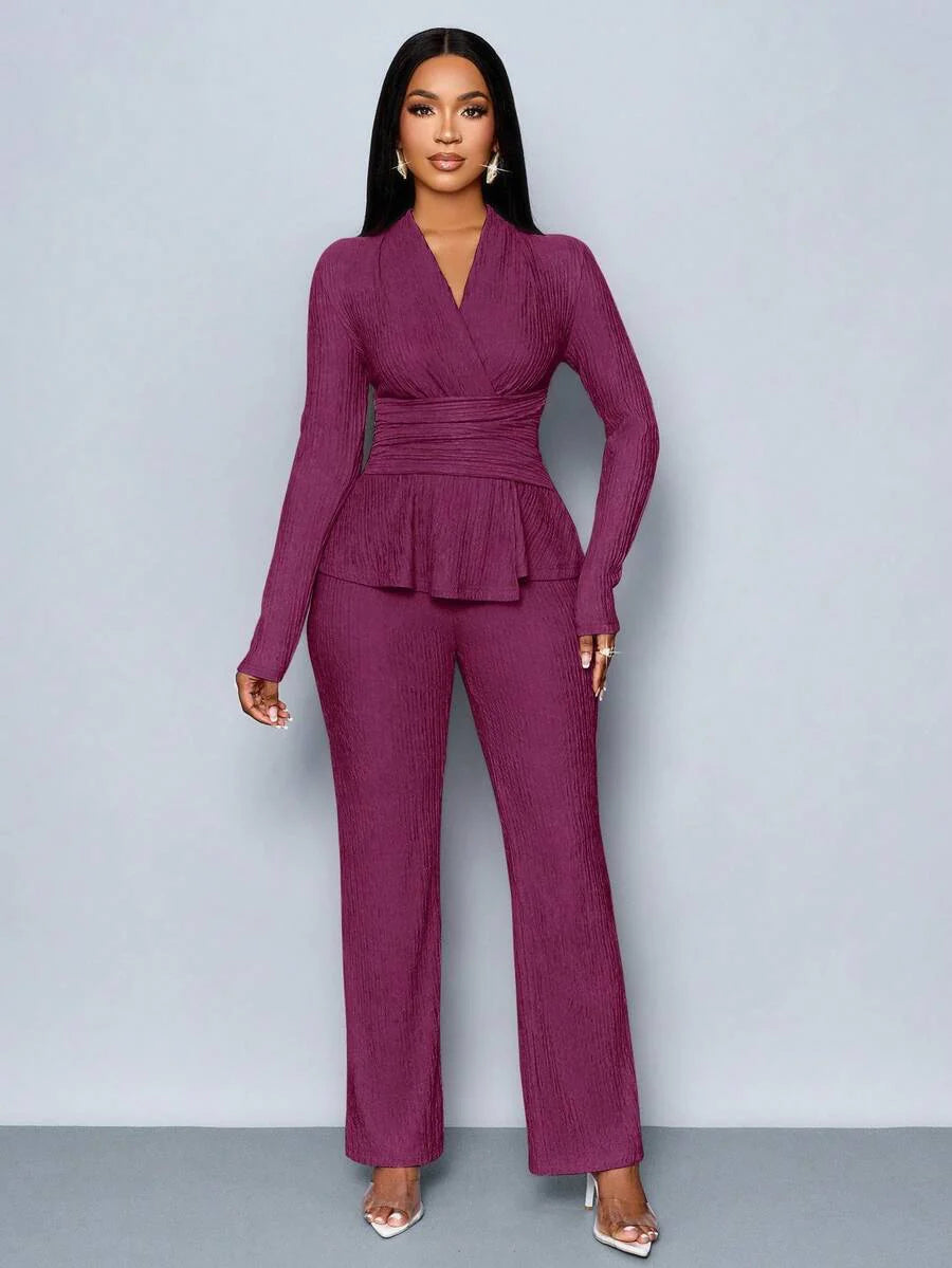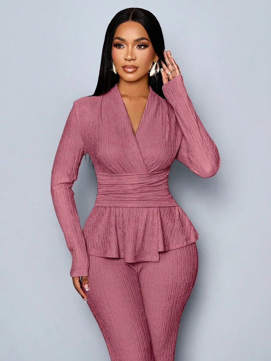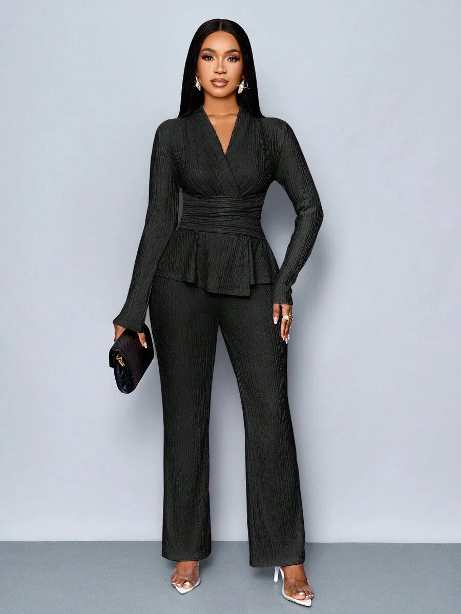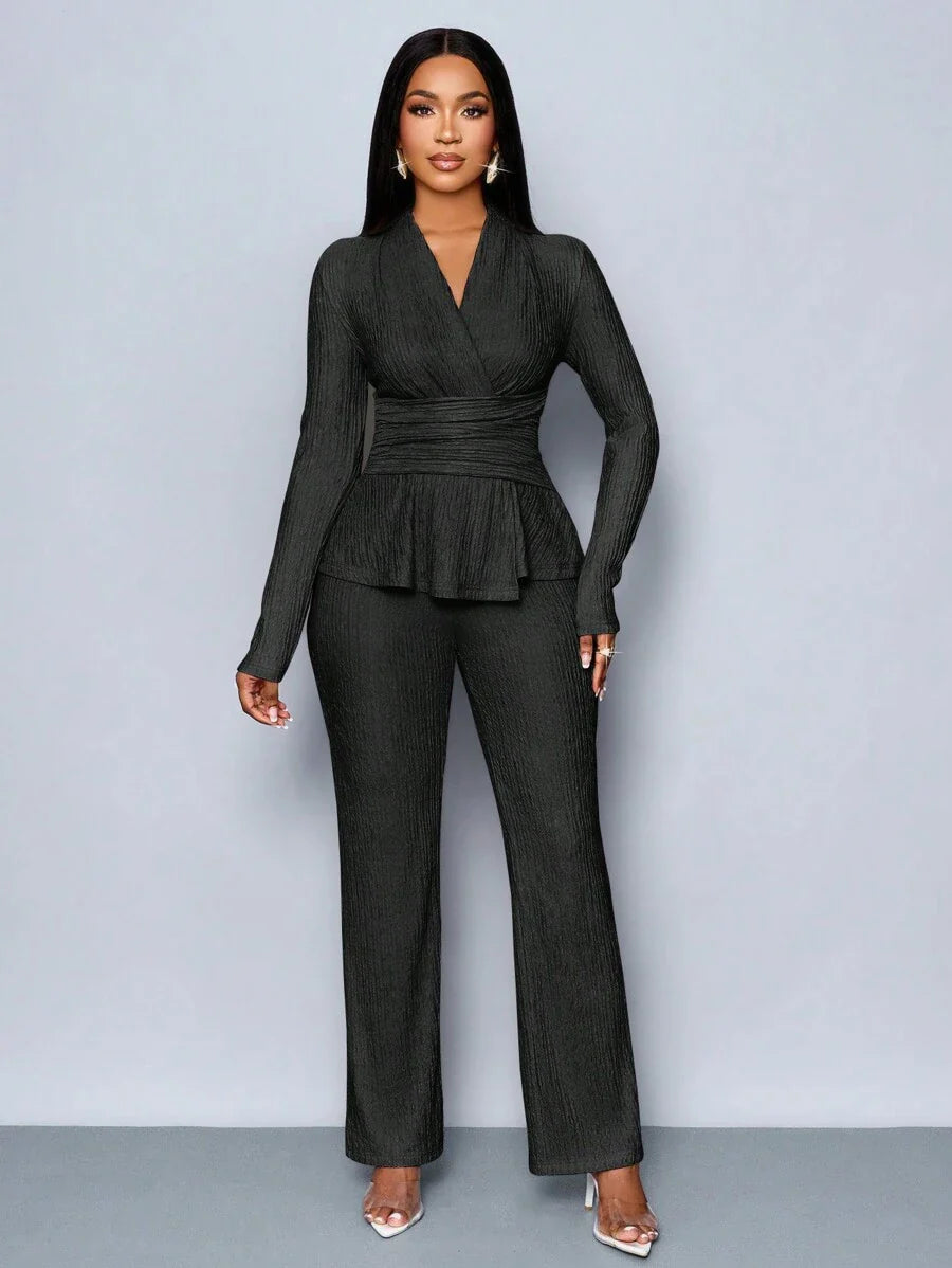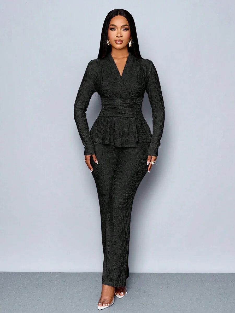 Completo da donna composto da maglietta a maniche lunghe con scollo a V e pantaloni a zampa d'elefante
