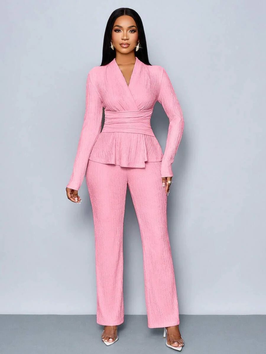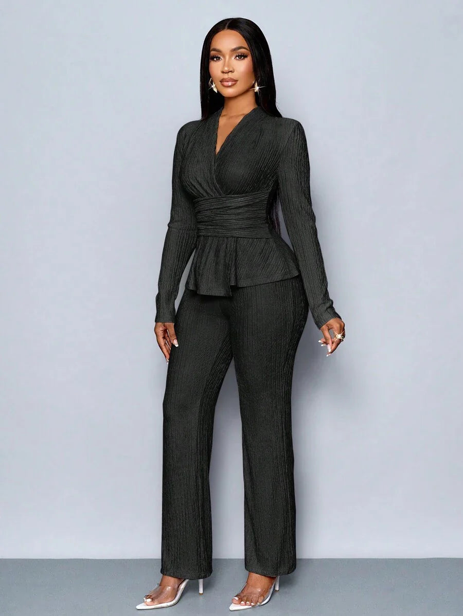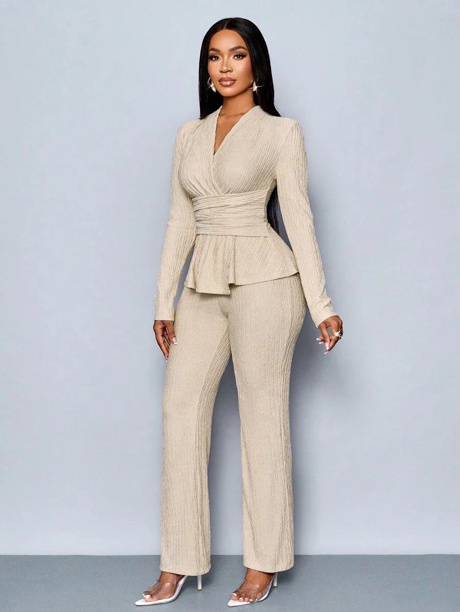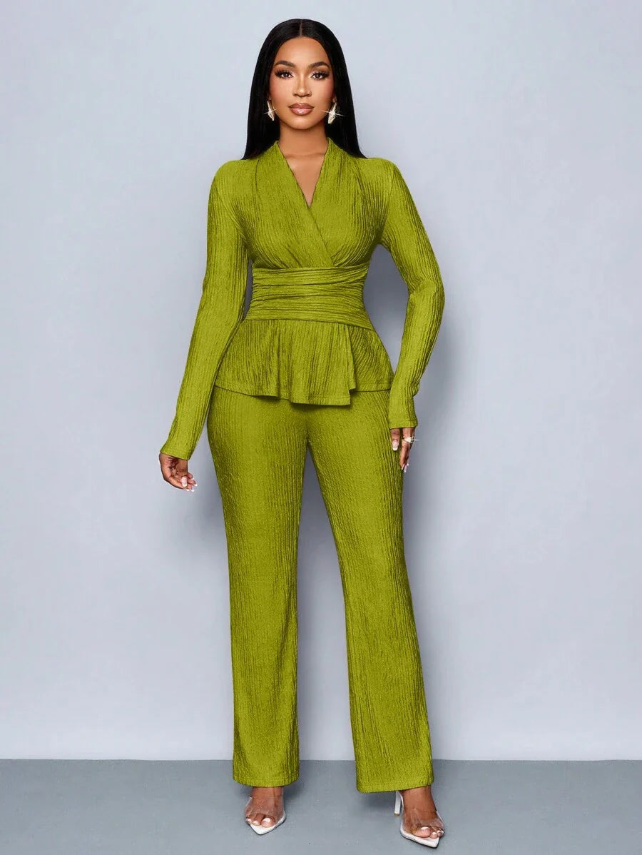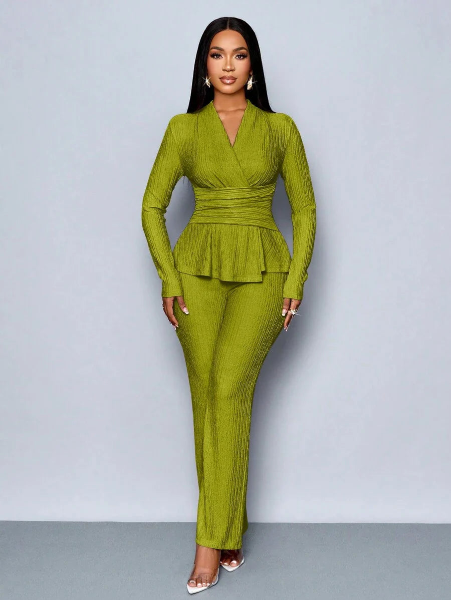 Completo da donna composto da maglietta a maniche lunghe con scollo a V e pantaloni a zampa d'elefante
