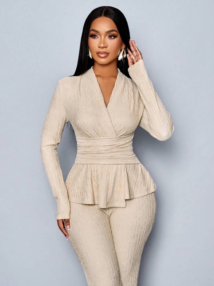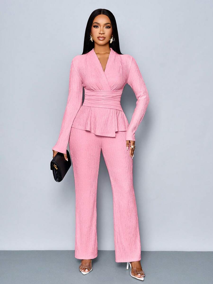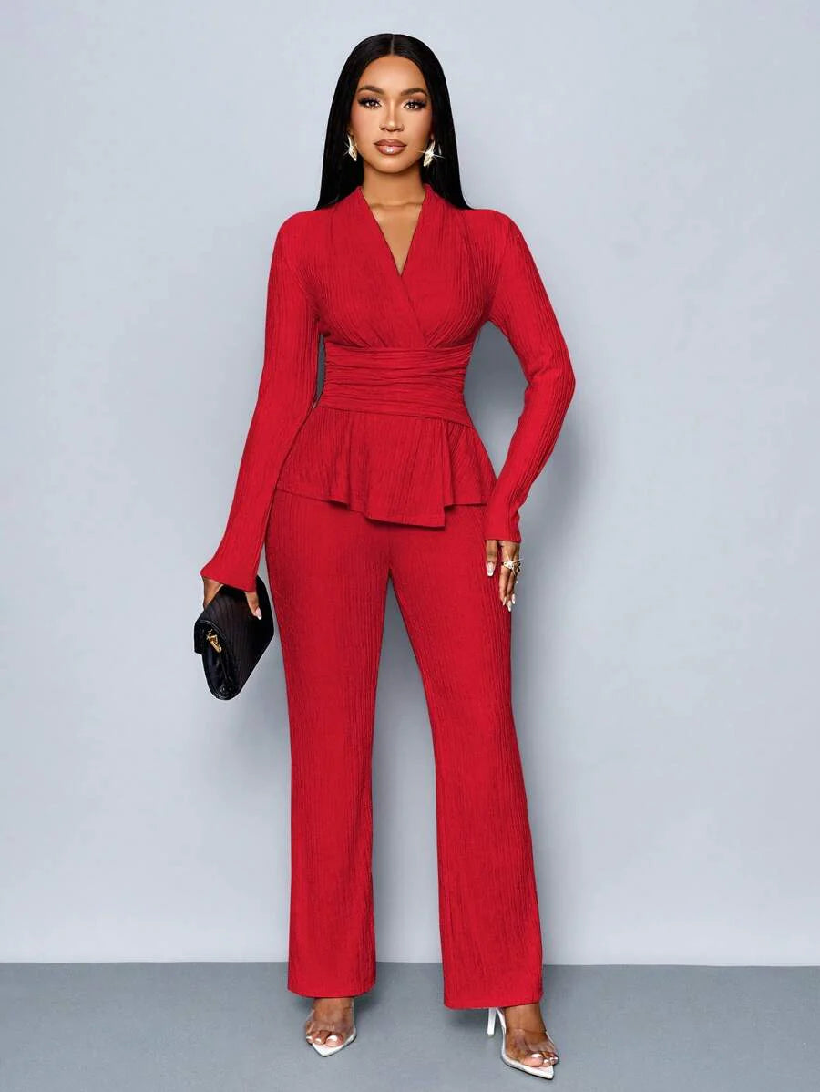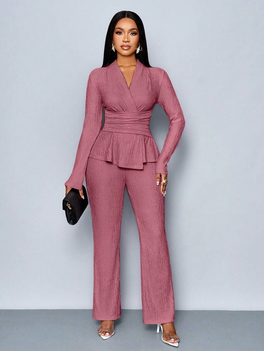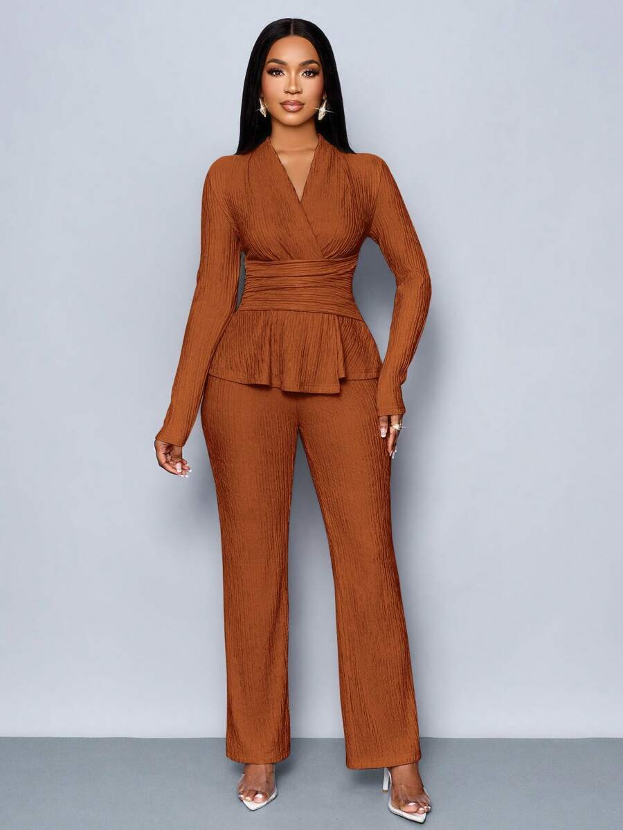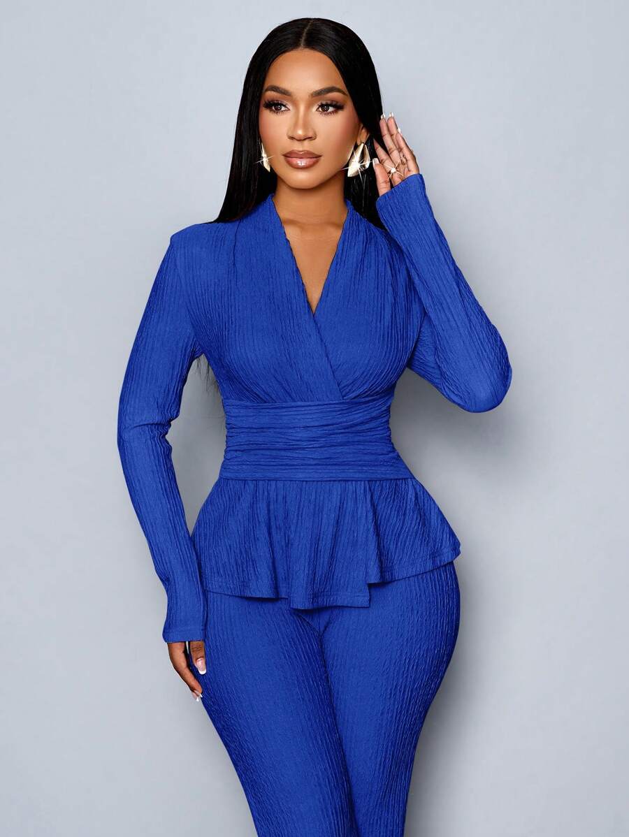 Completo da donna composto da maglietta a maniche lunghe con scollo a V e pantaloni a zampa d'elefante