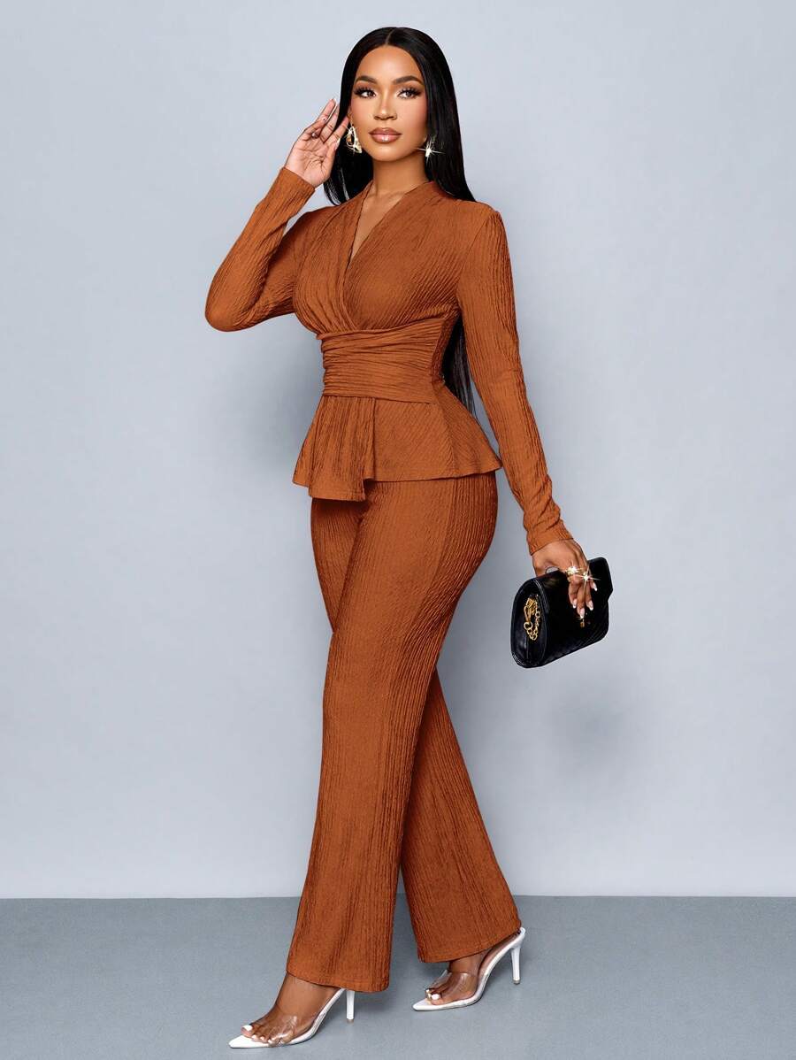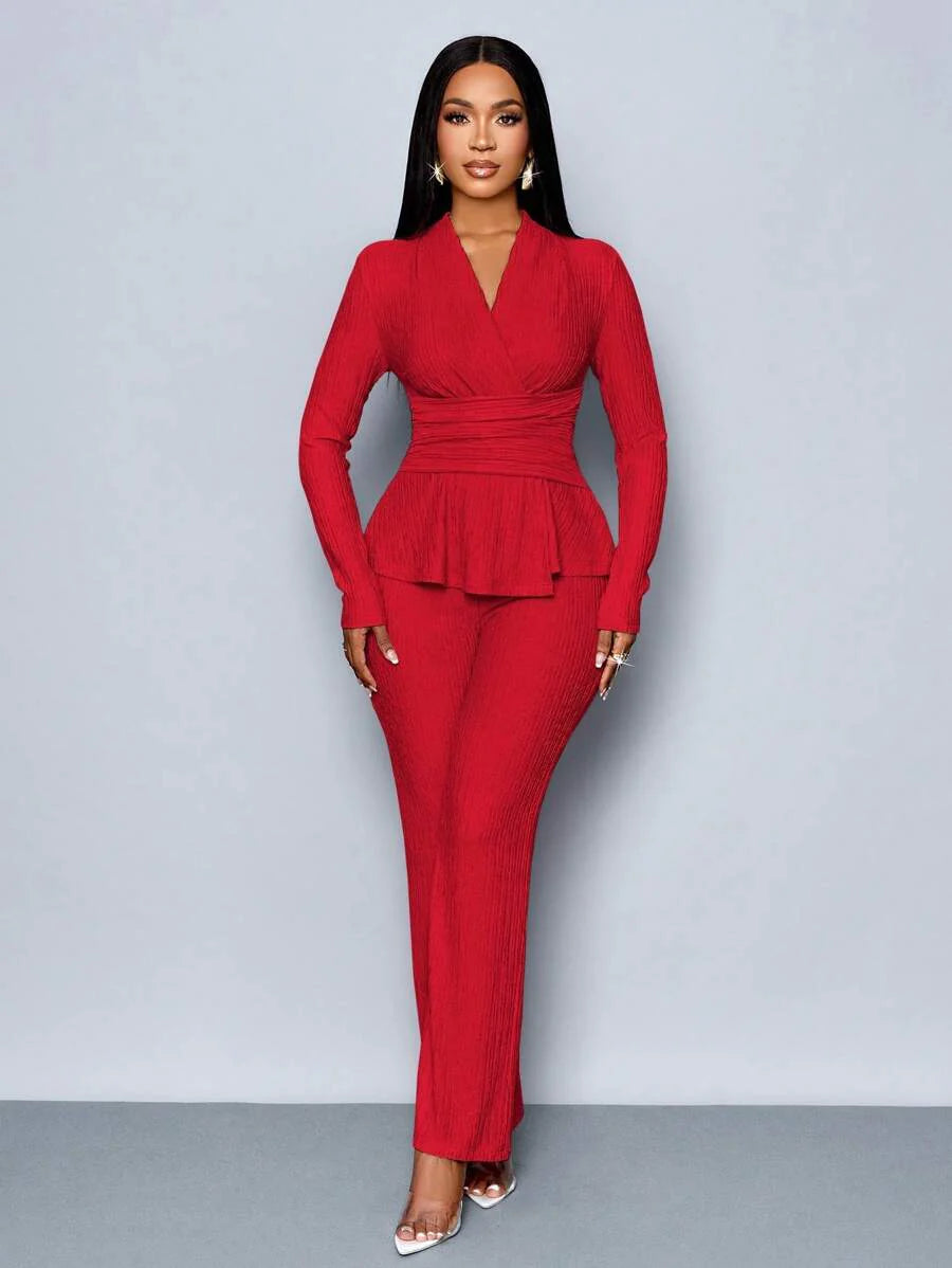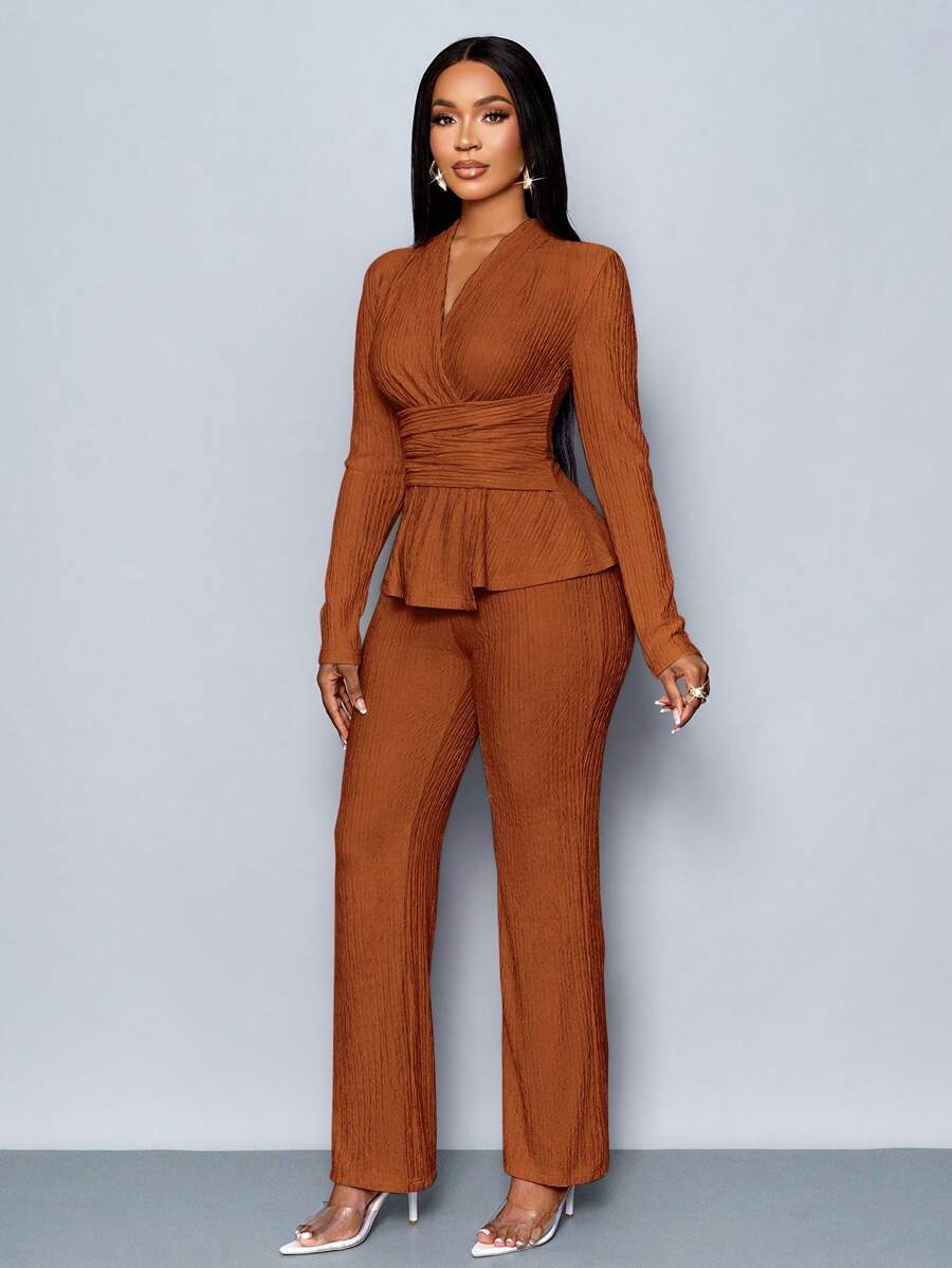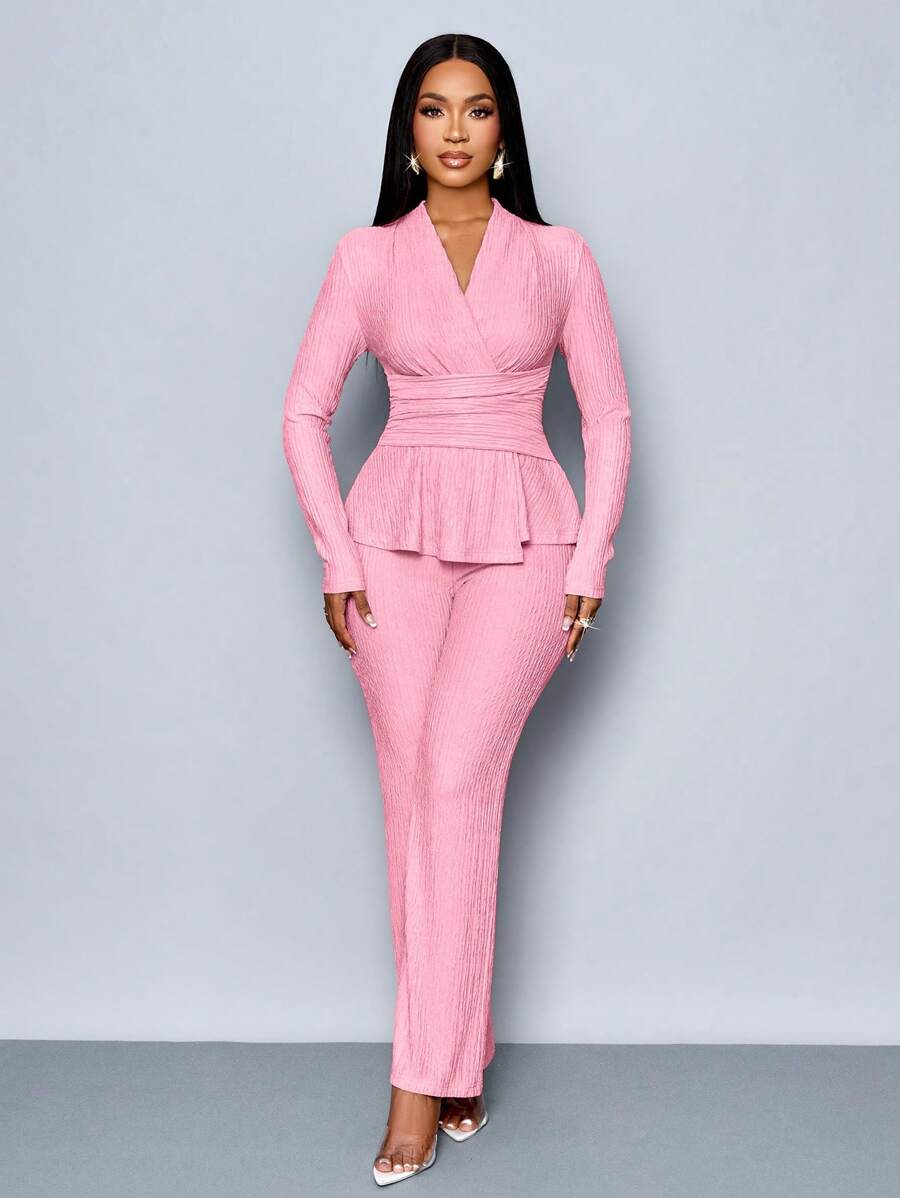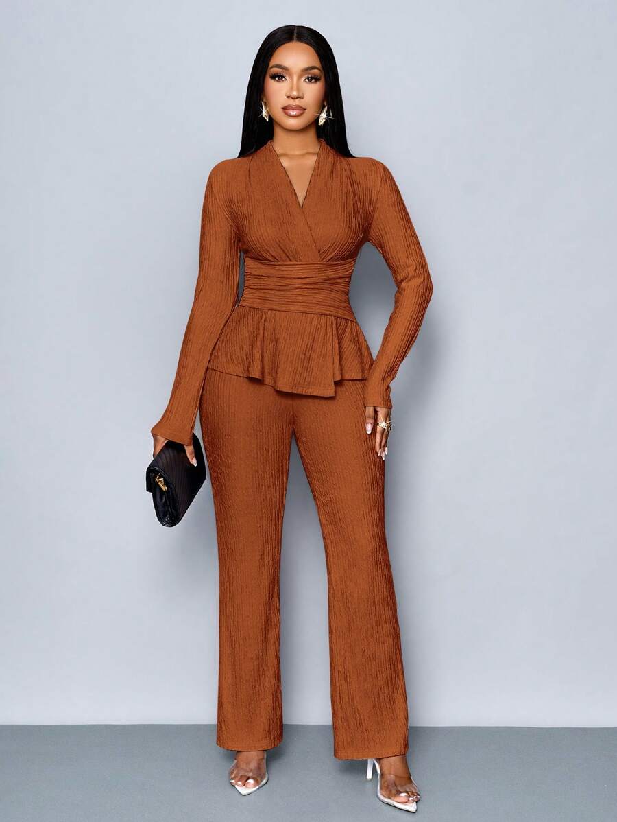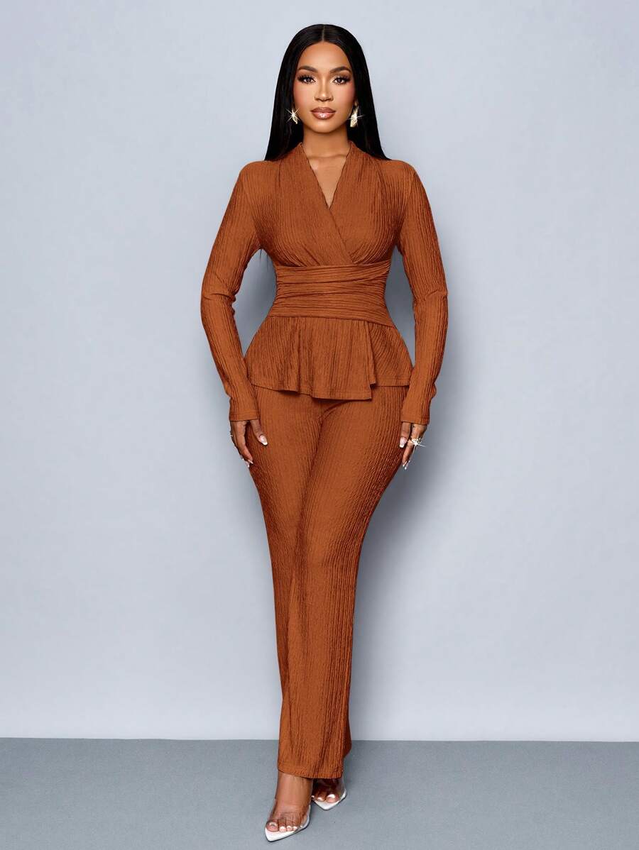 Completo da donna composto da maglietta a maniche lunghe con scollo a V e pantaloni a zampa d'elefante