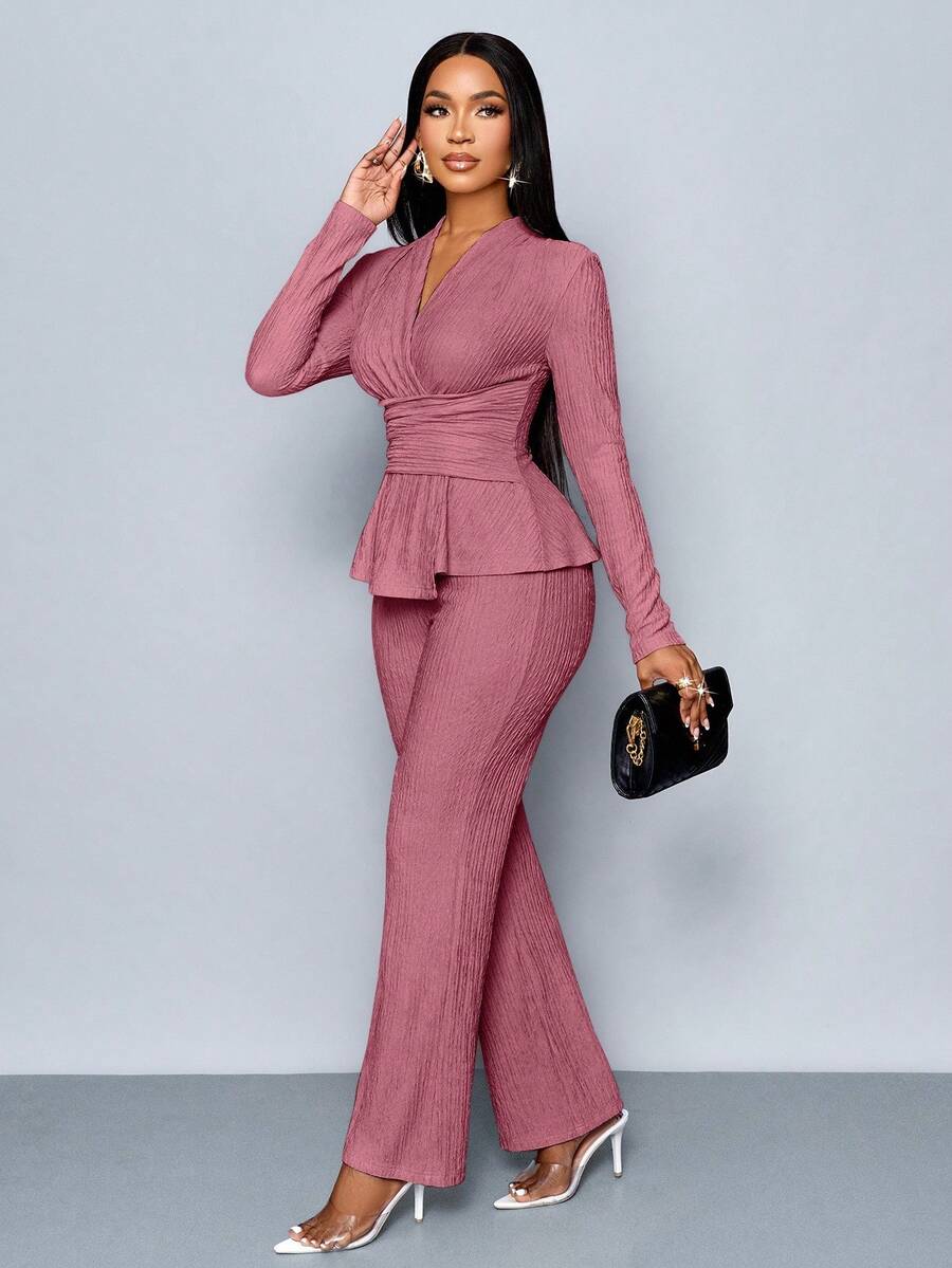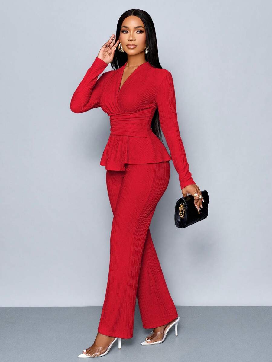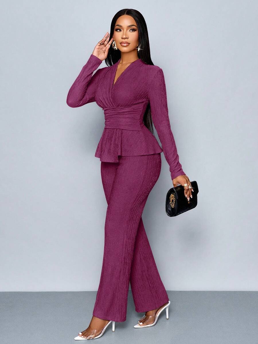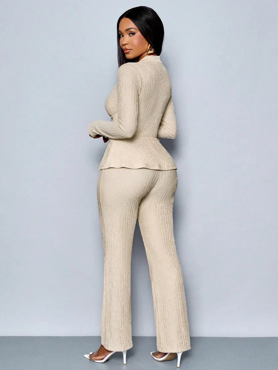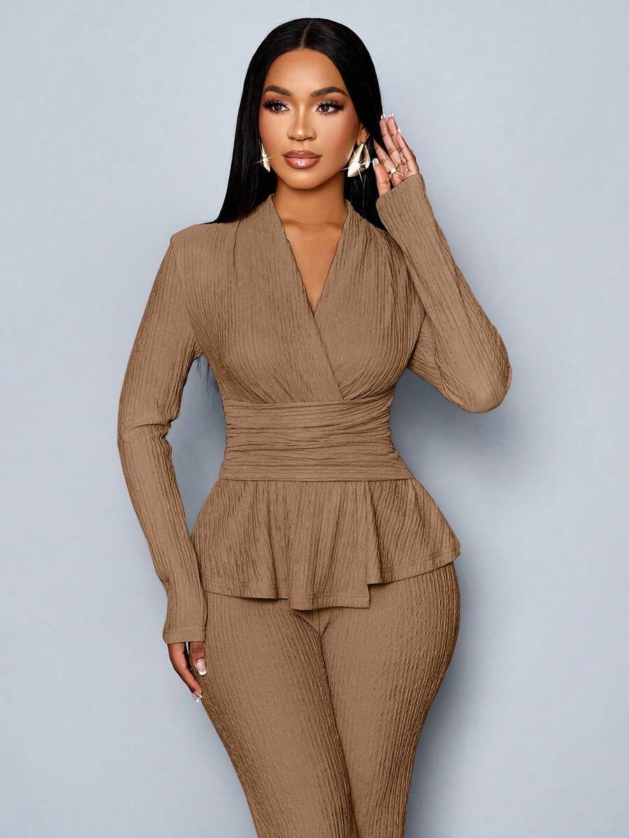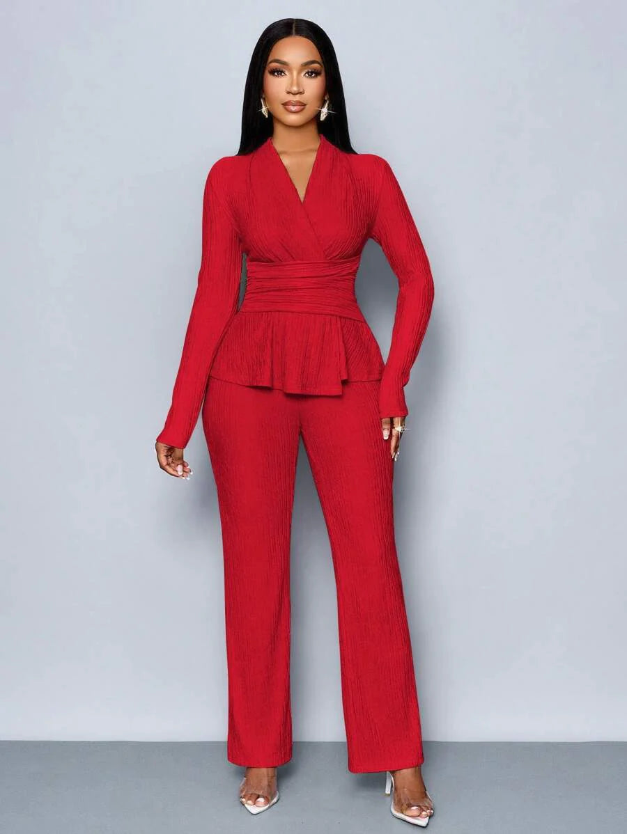 Completo da donna composto da maglietta a maniche lunghe con scollo a V e pantaloni a zampa d'elefante