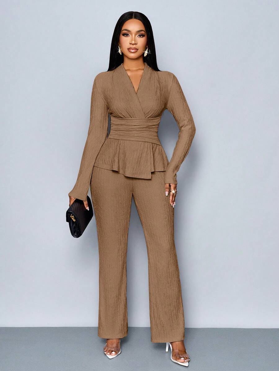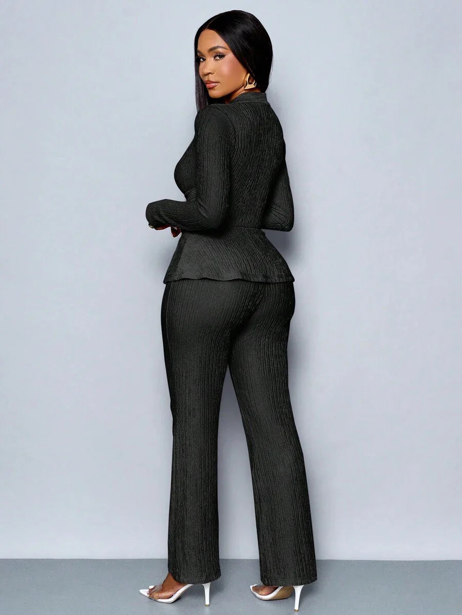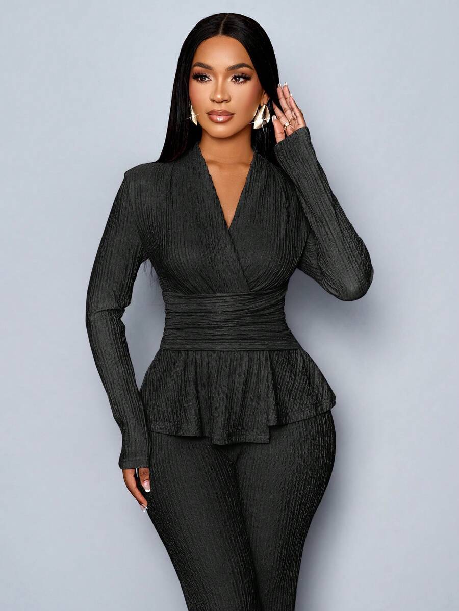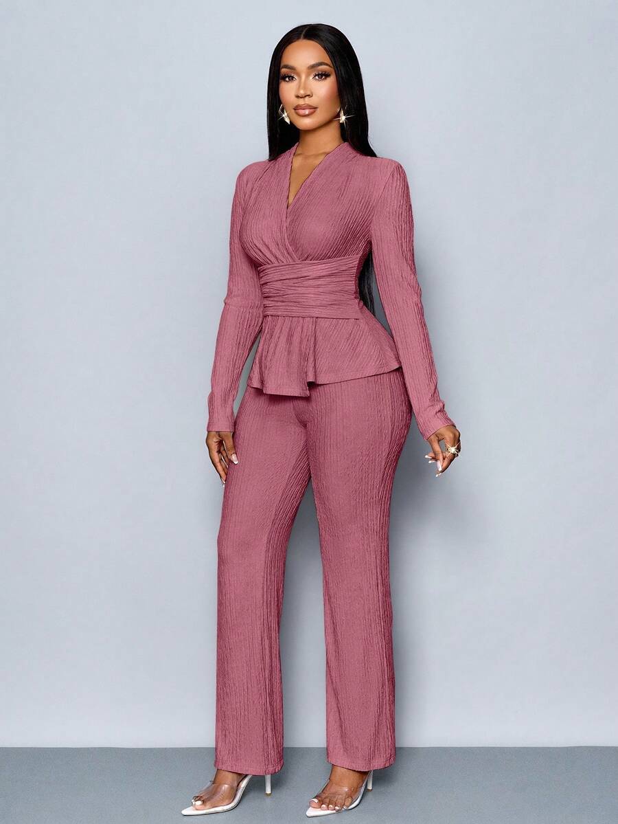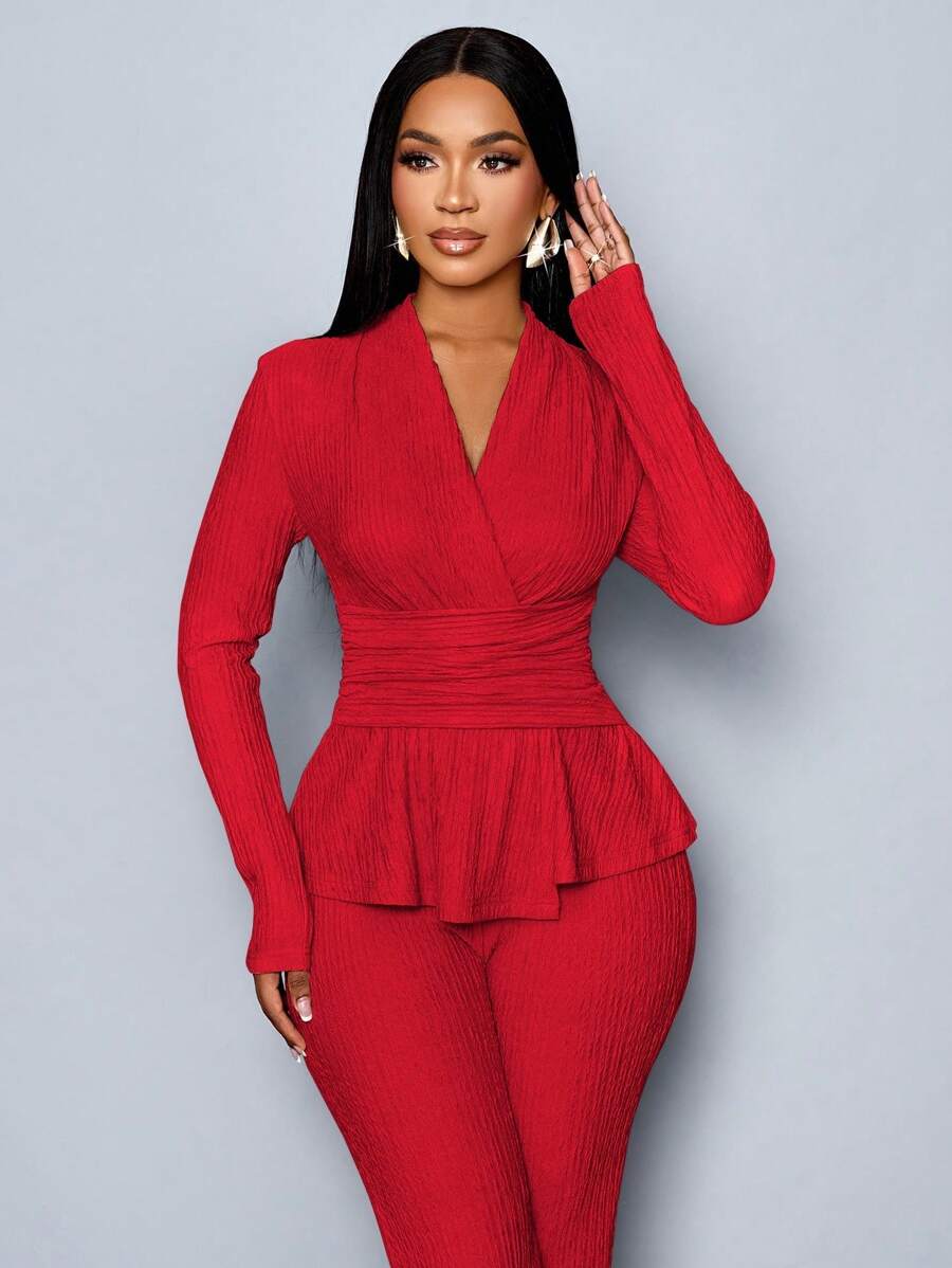 Completo da donna composto da maglietta a maniche lunghe con scollo a V e pantaloni a zampa d'elefante