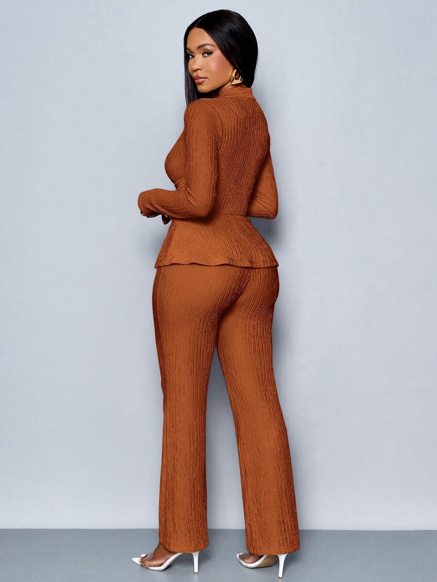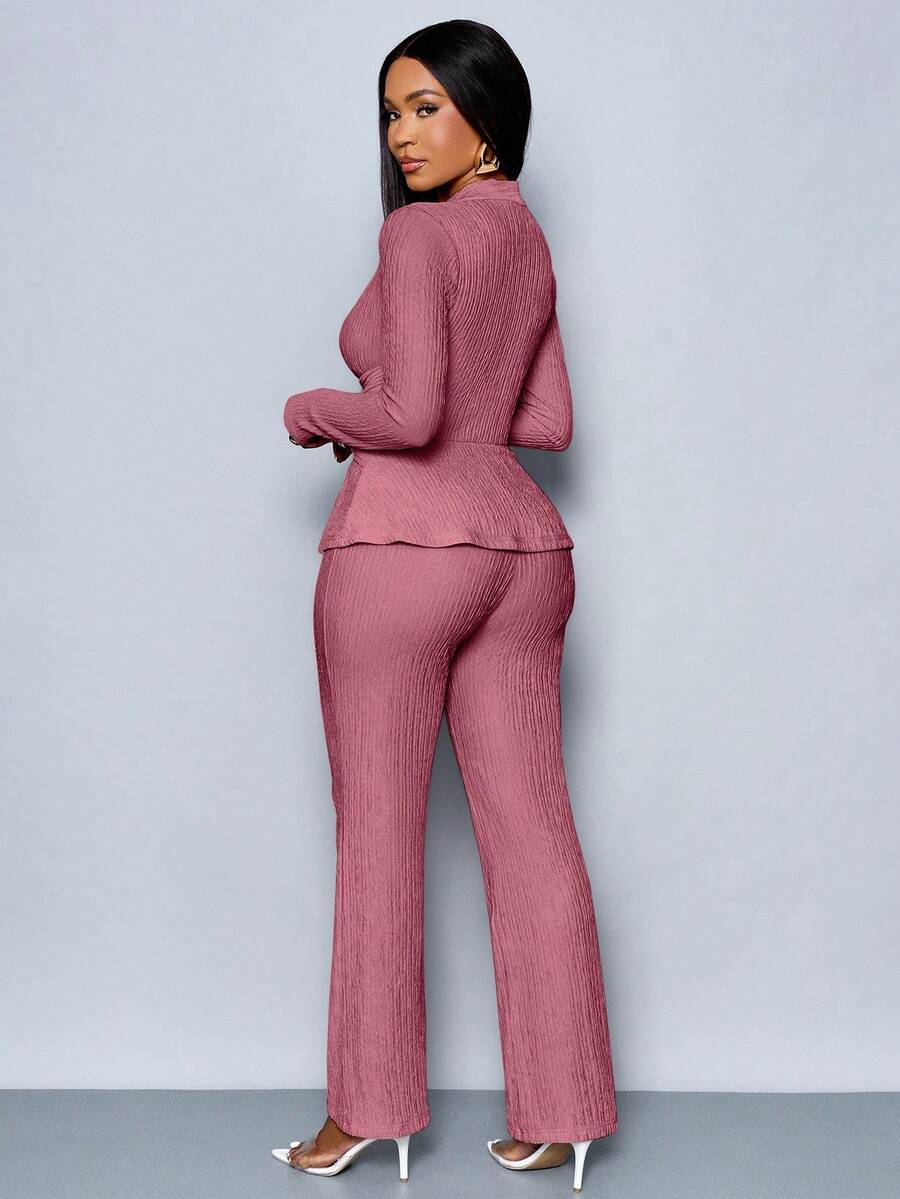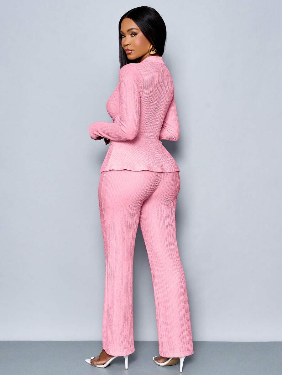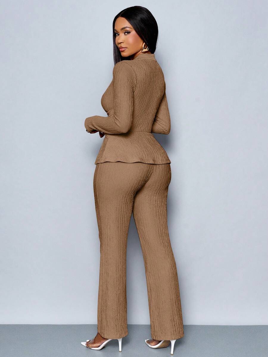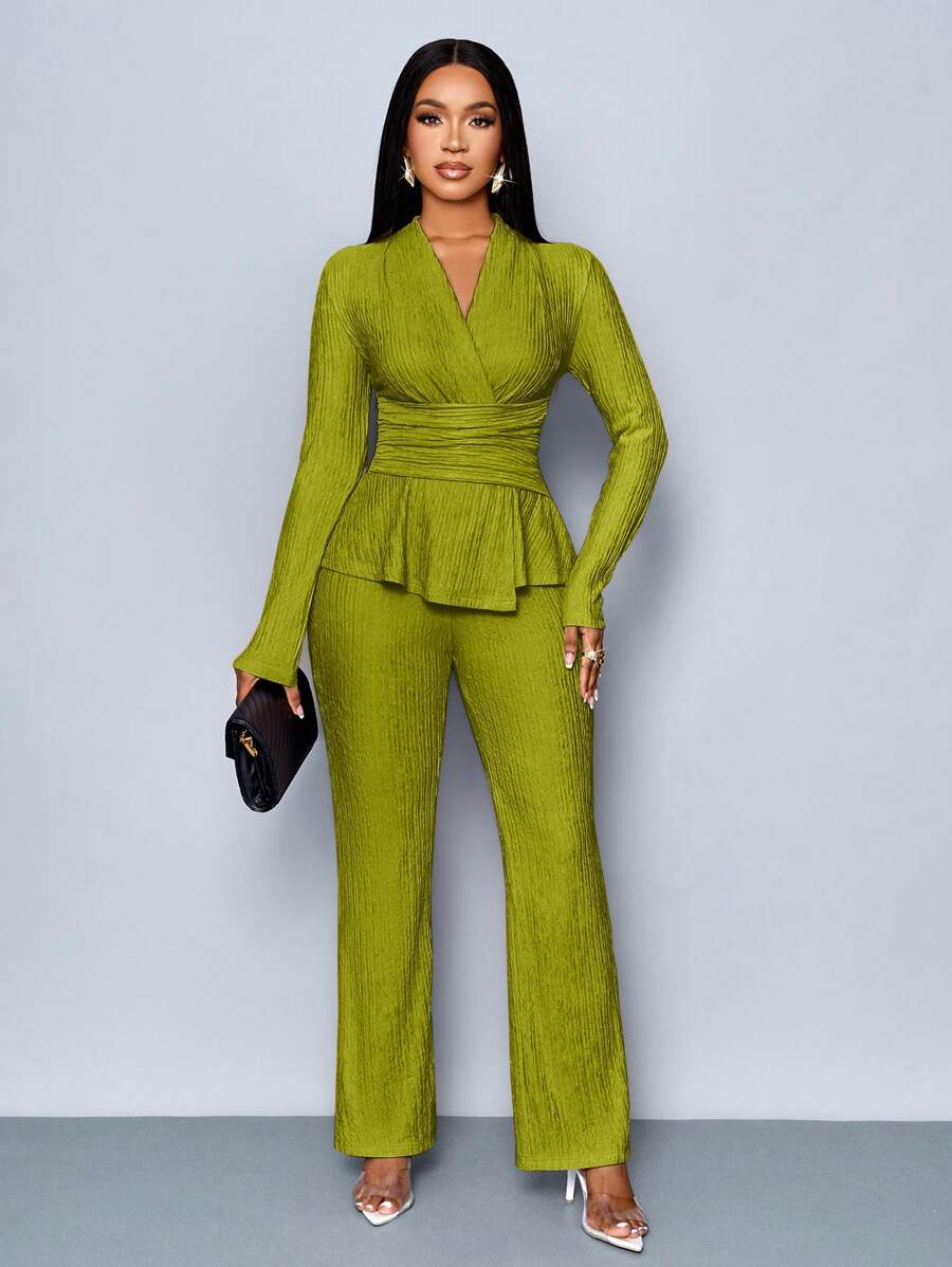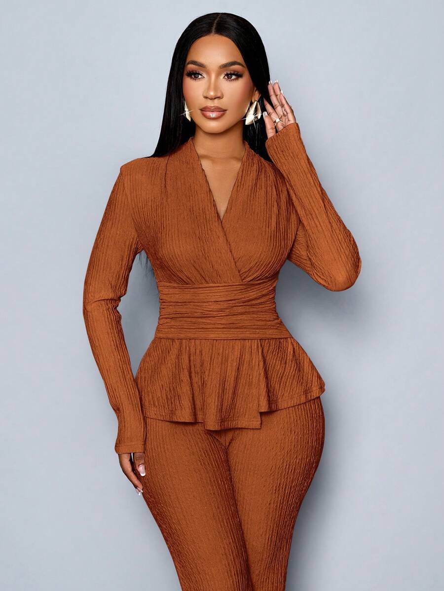 Completo da donna composto da maglietta a maniche lunghe con scollo a V e pantaloni a zampa d'elefante