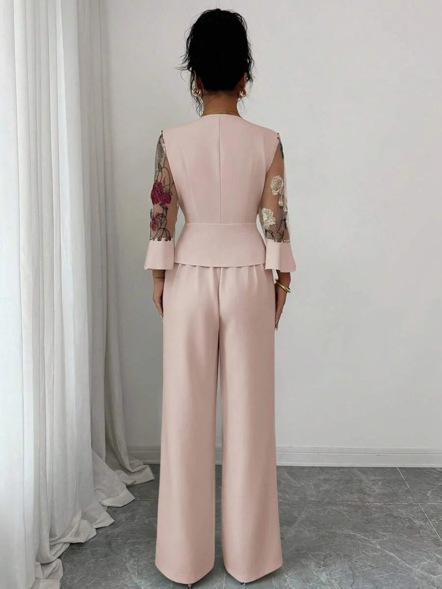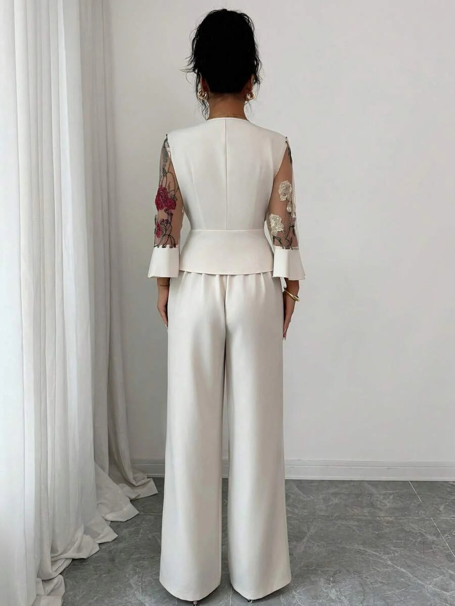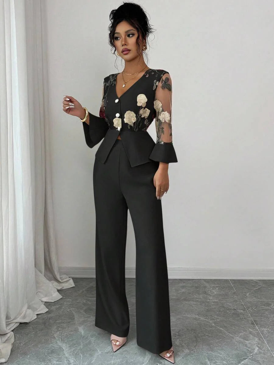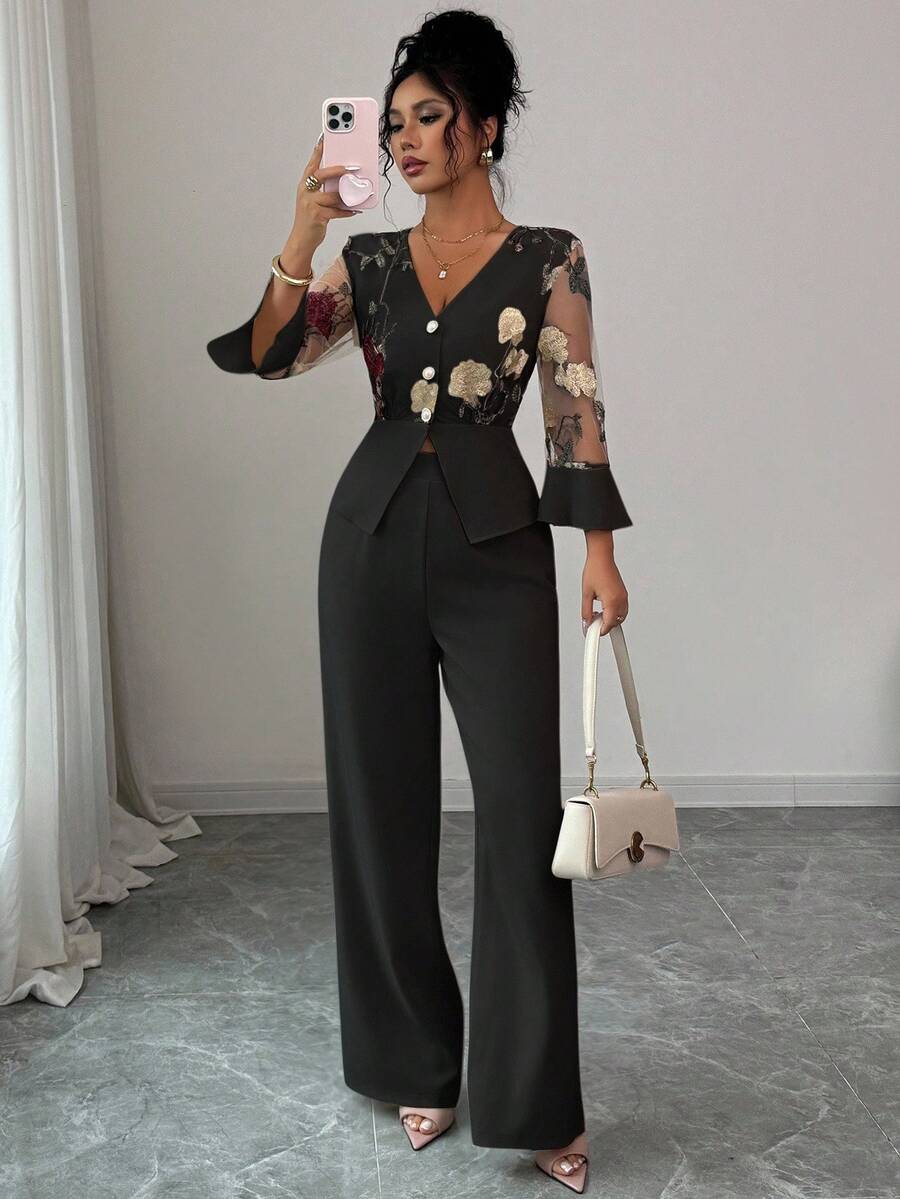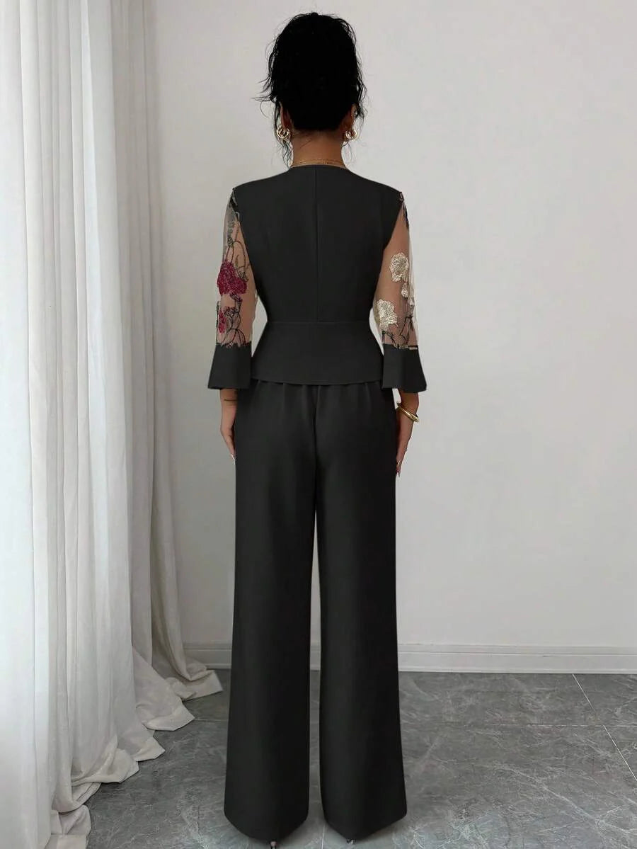 Elegante completo da donna in 2 pezzi con ricamo in rete, top a maniche medie