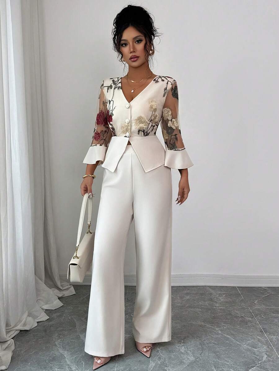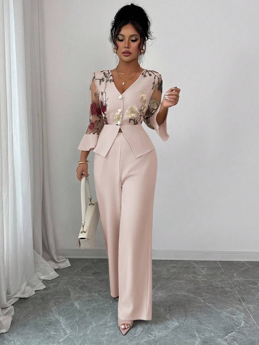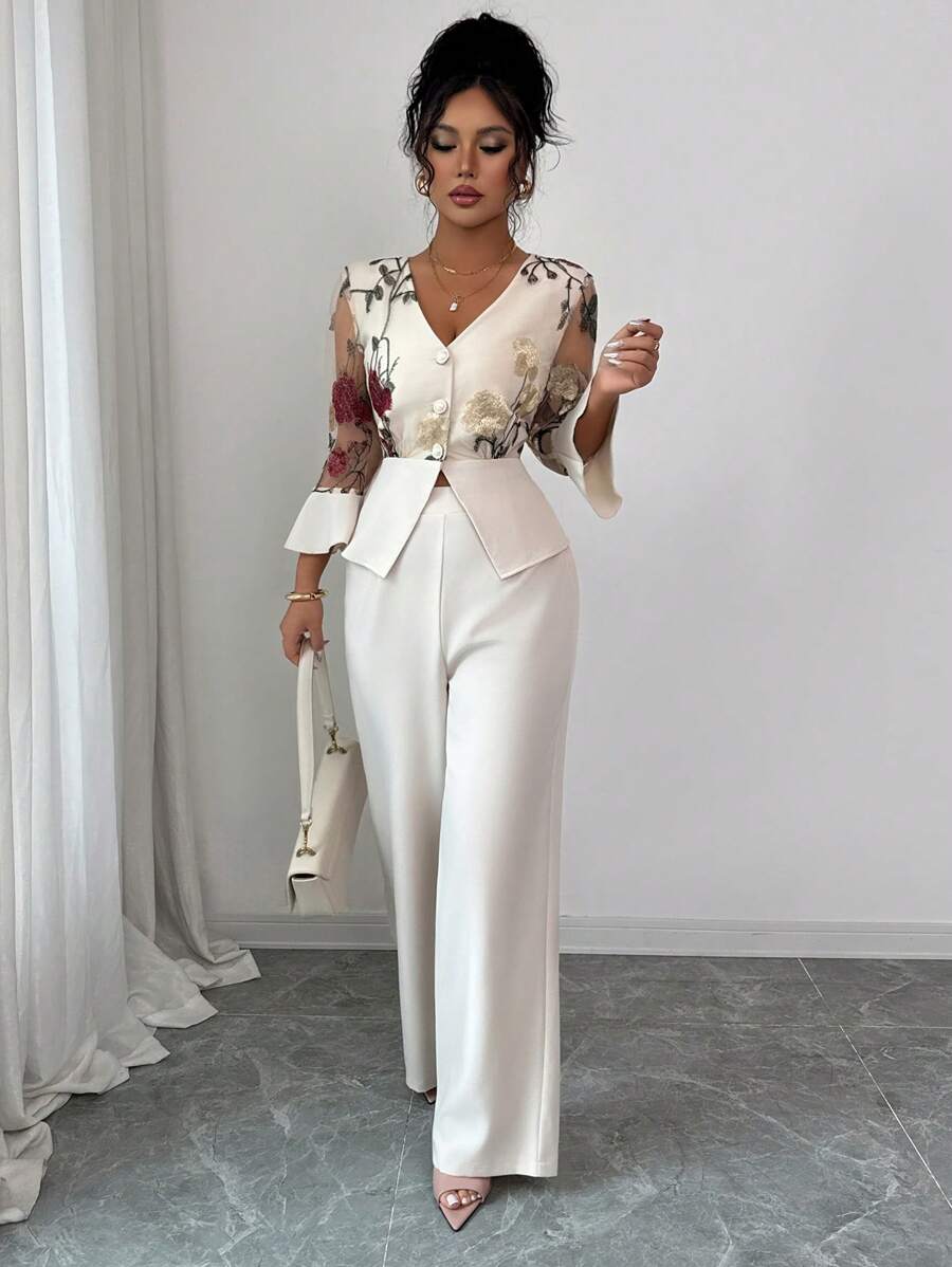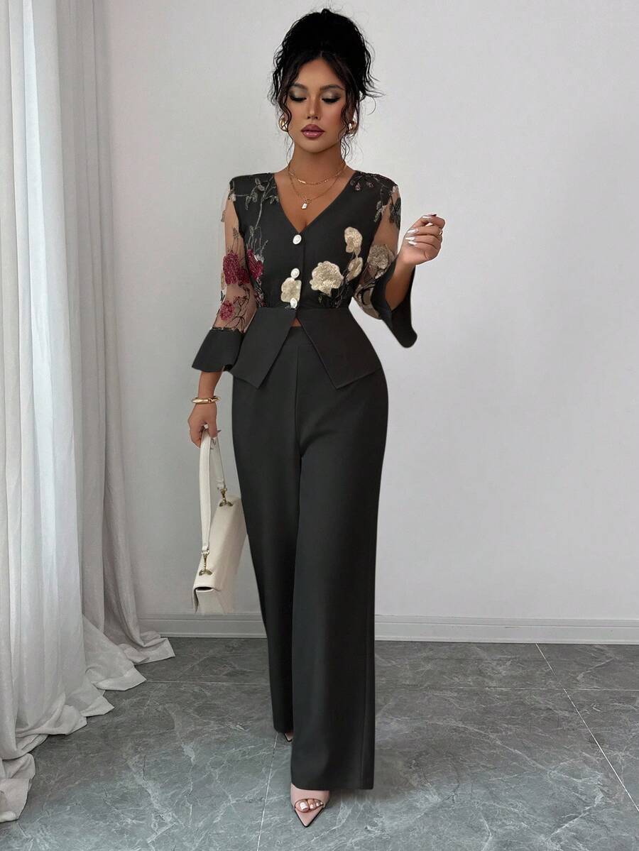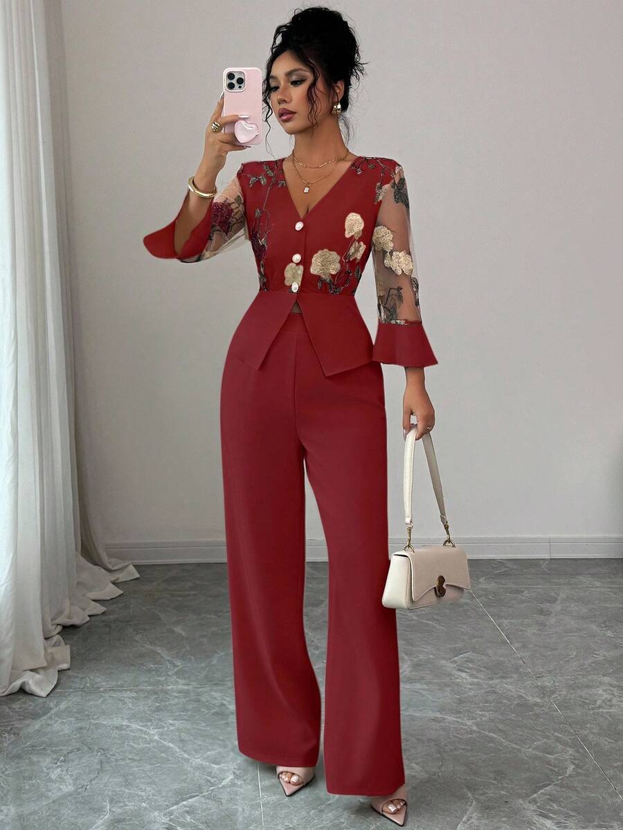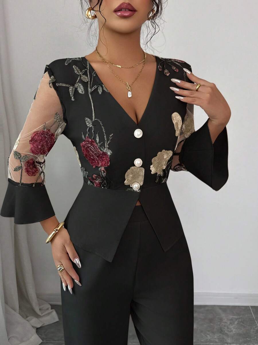 Elegante completo da donna in 2 pezzi con ricamo in rete, top a maniche medie