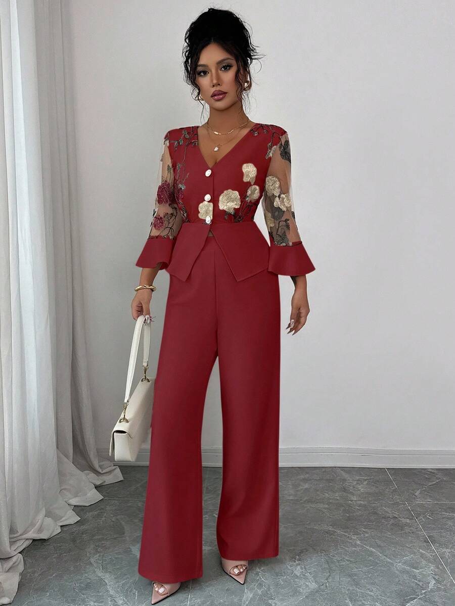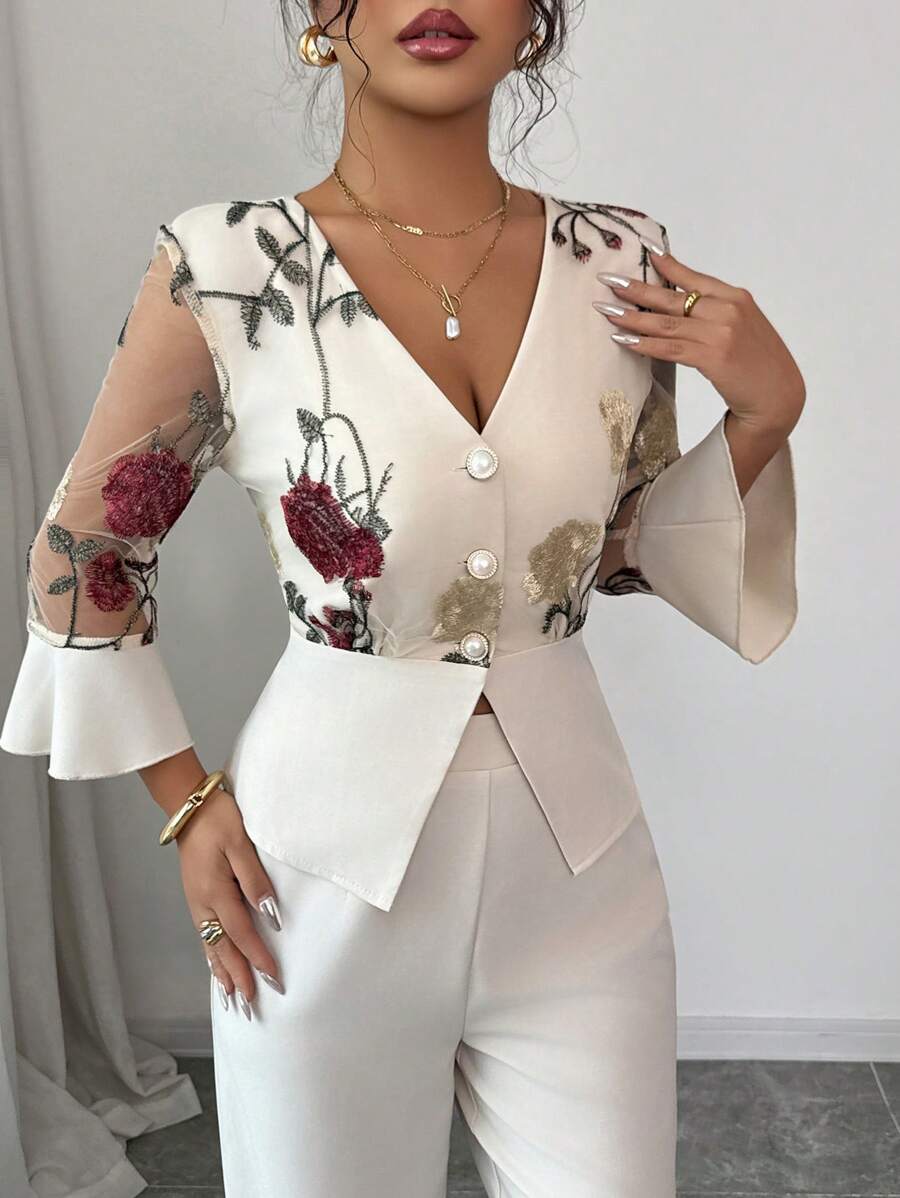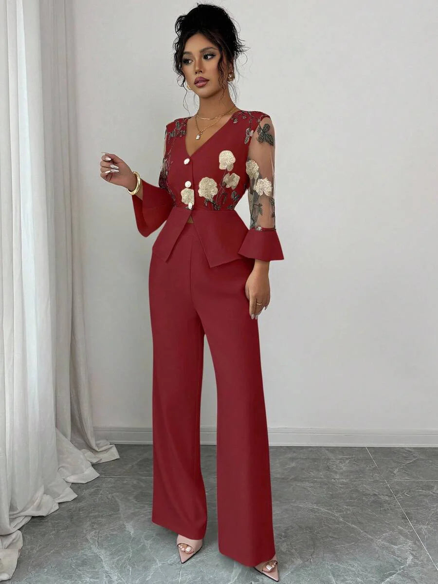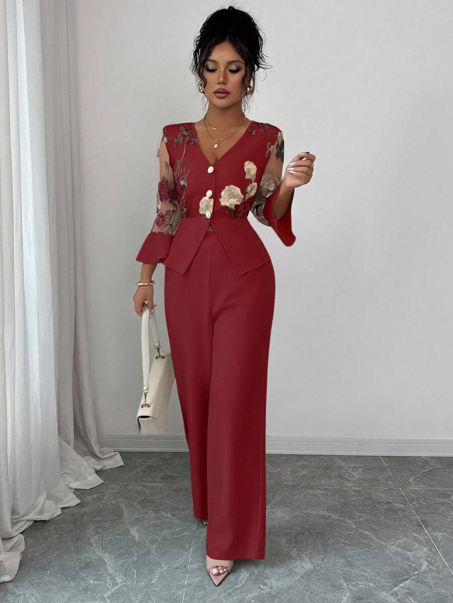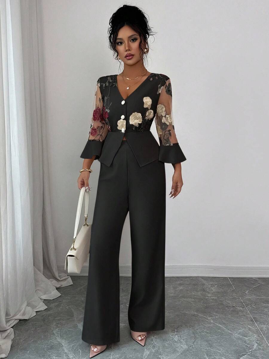 Elegante completo da donna in 2 pezzi con ricamo in rete, top a maniche medie