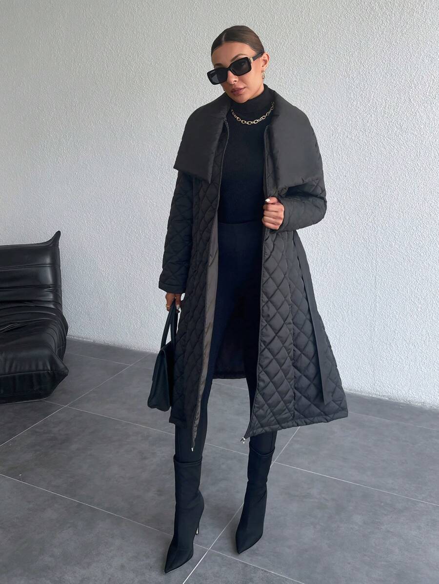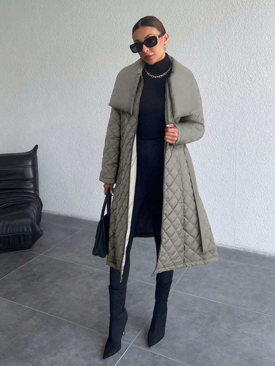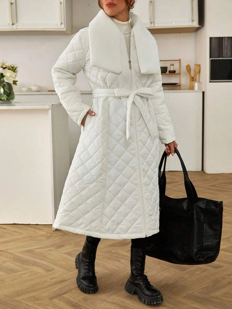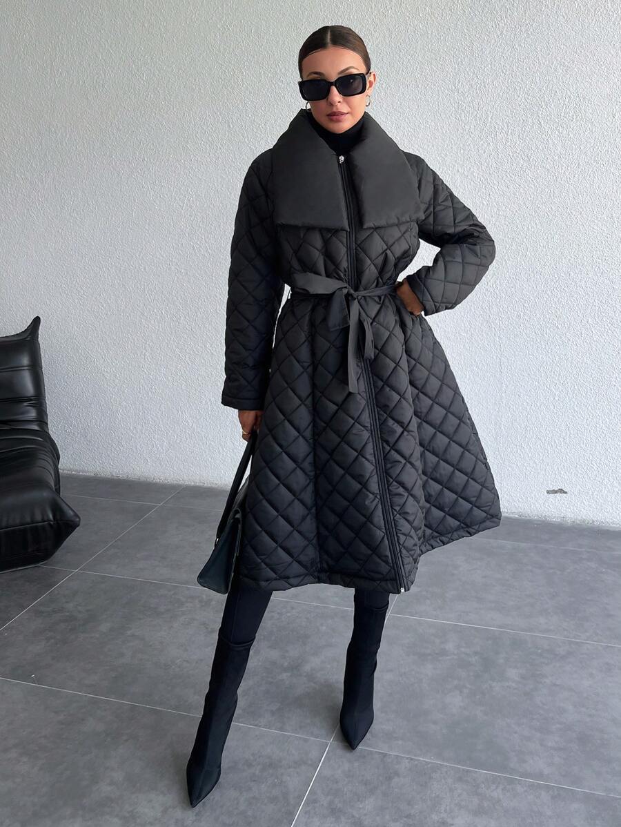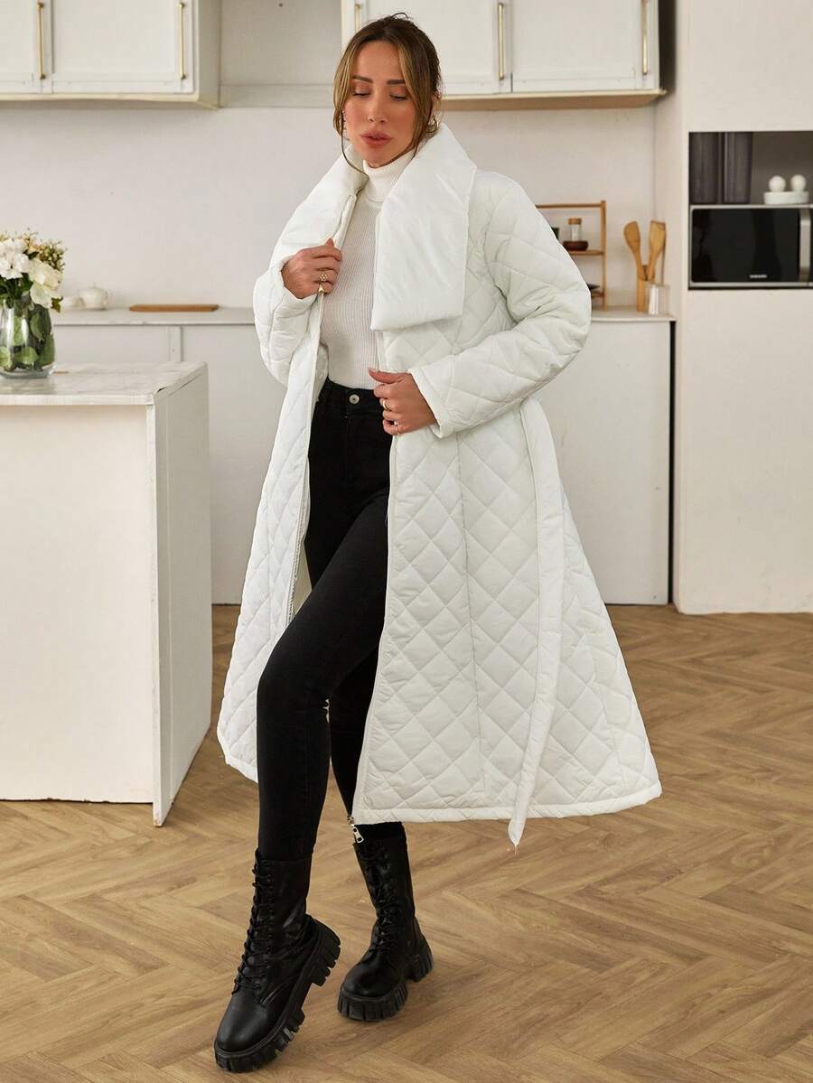Giacca invernale lunga imbottita con collo sciallato alla francese, cintura e cerniera