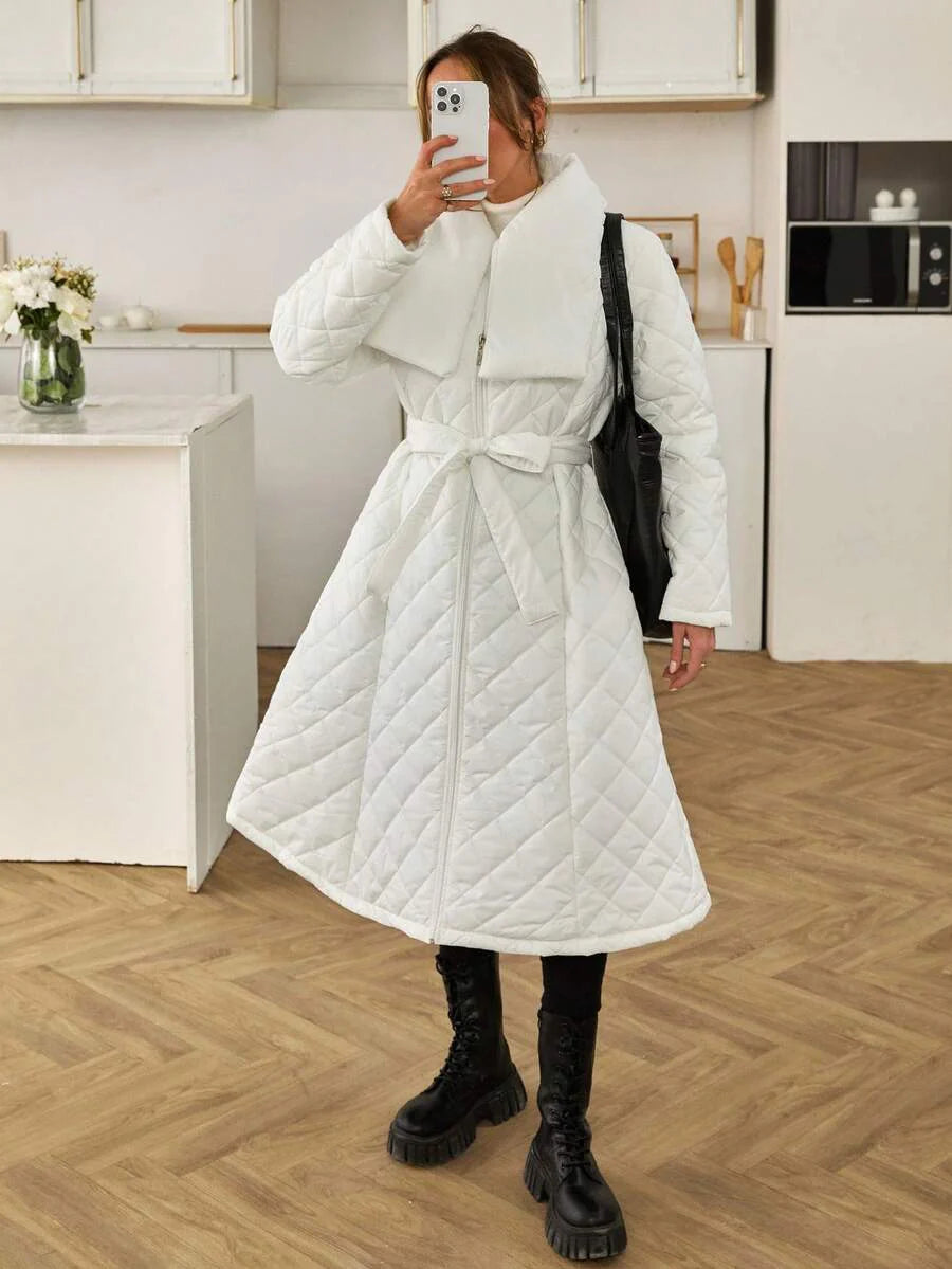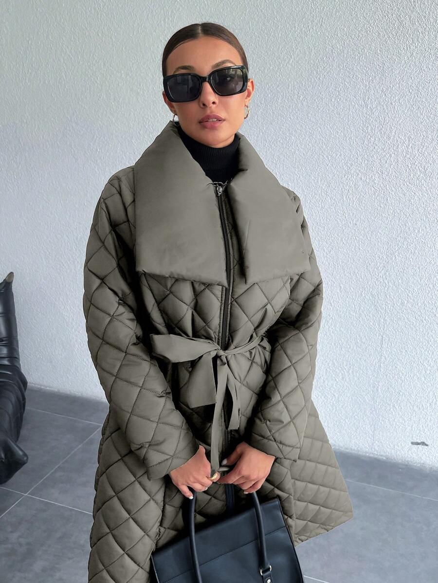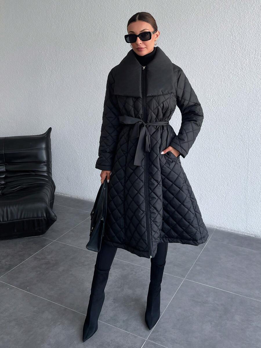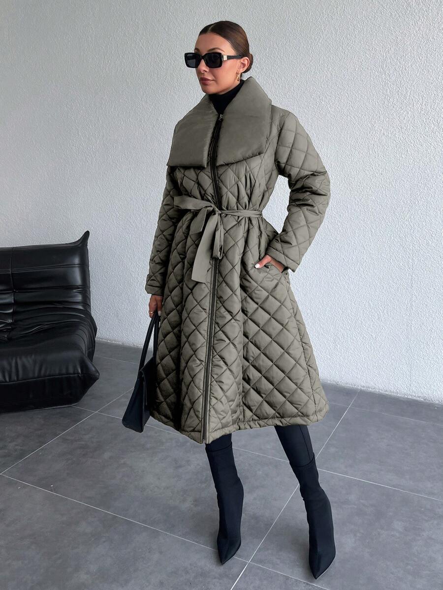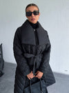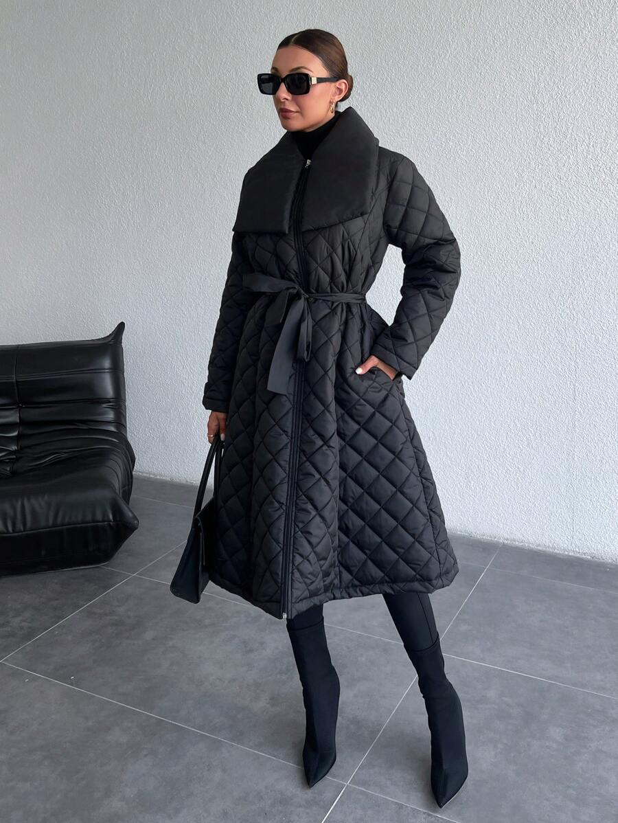 Giacca invernale lunga imbottita con collo sciallato alla francese, cintura e cerniera