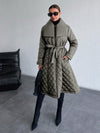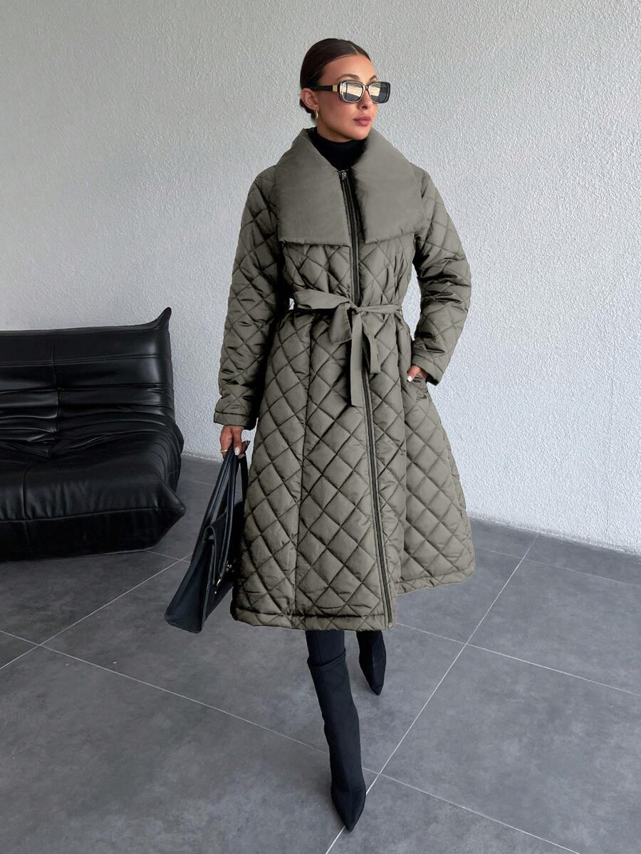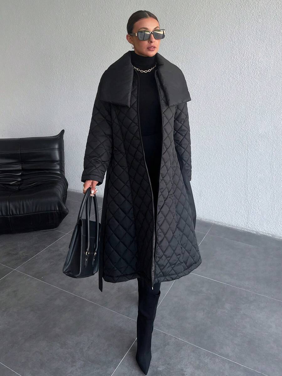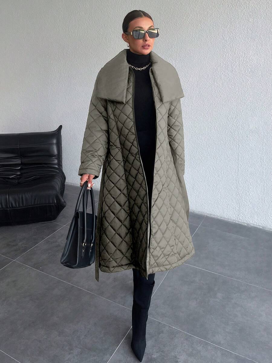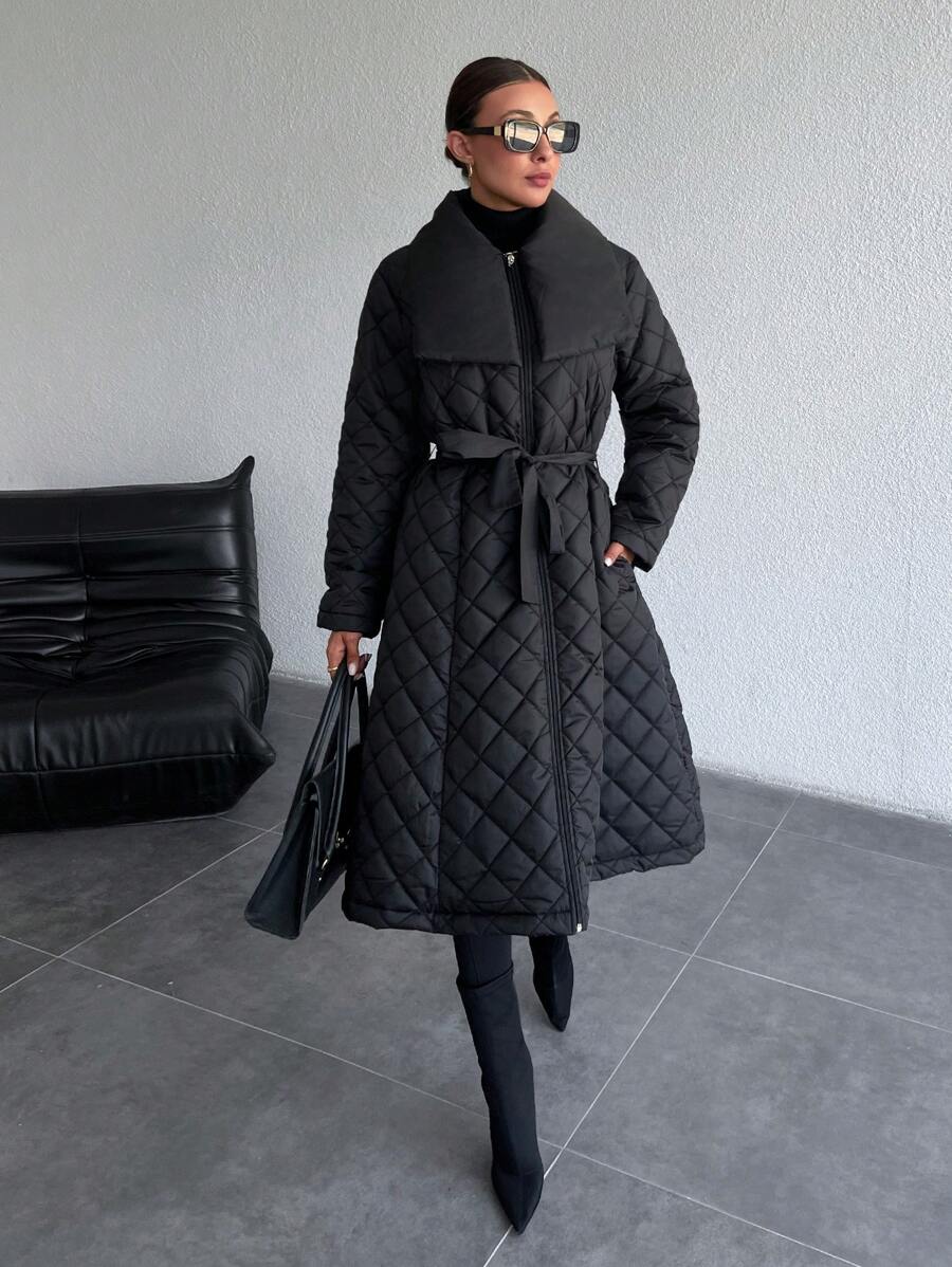 Giacca invernale lunga imbottita con collo sciallato alla francese, cintura e cerniera