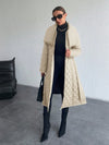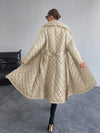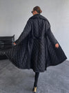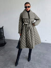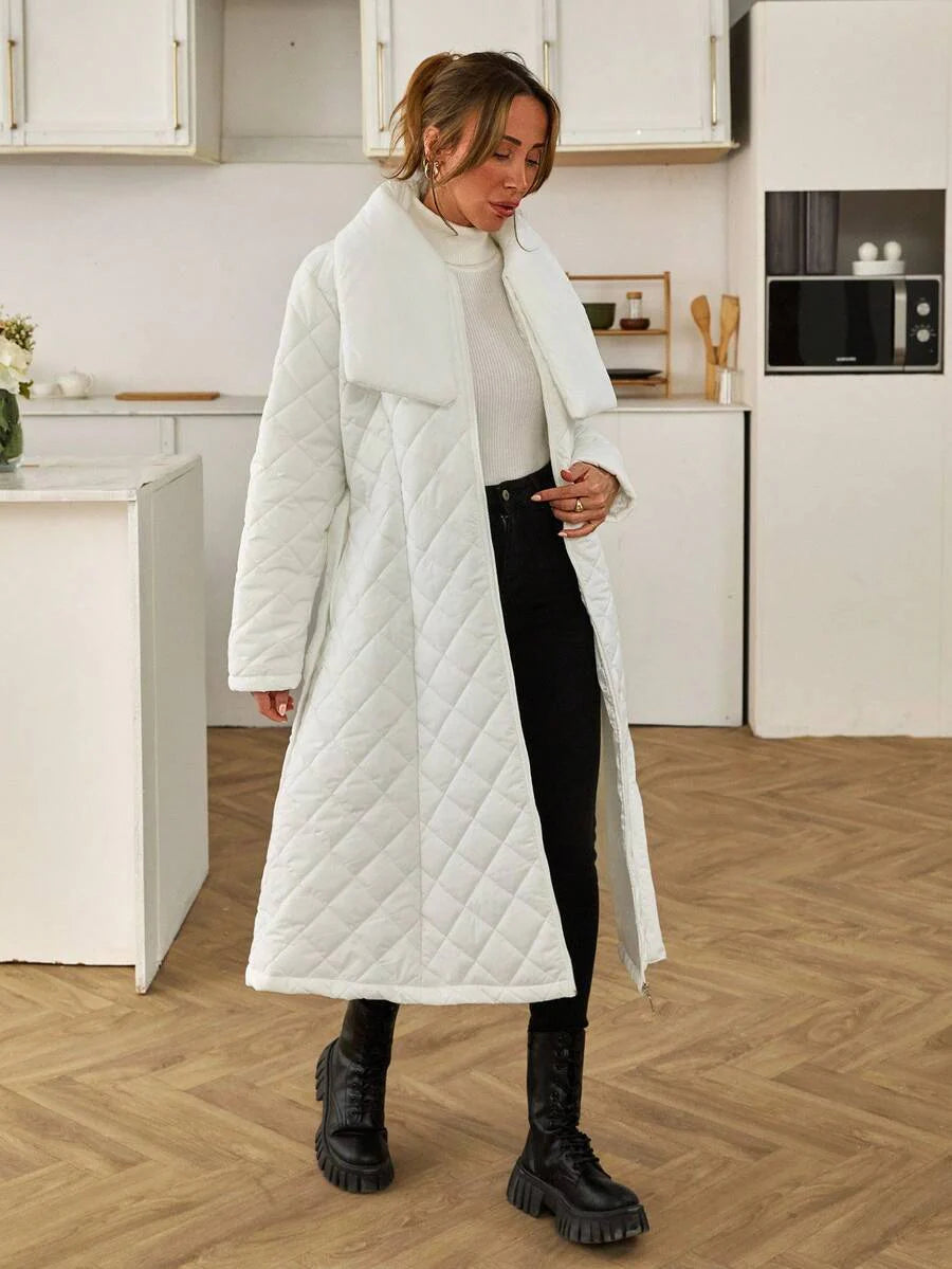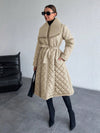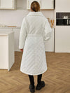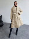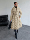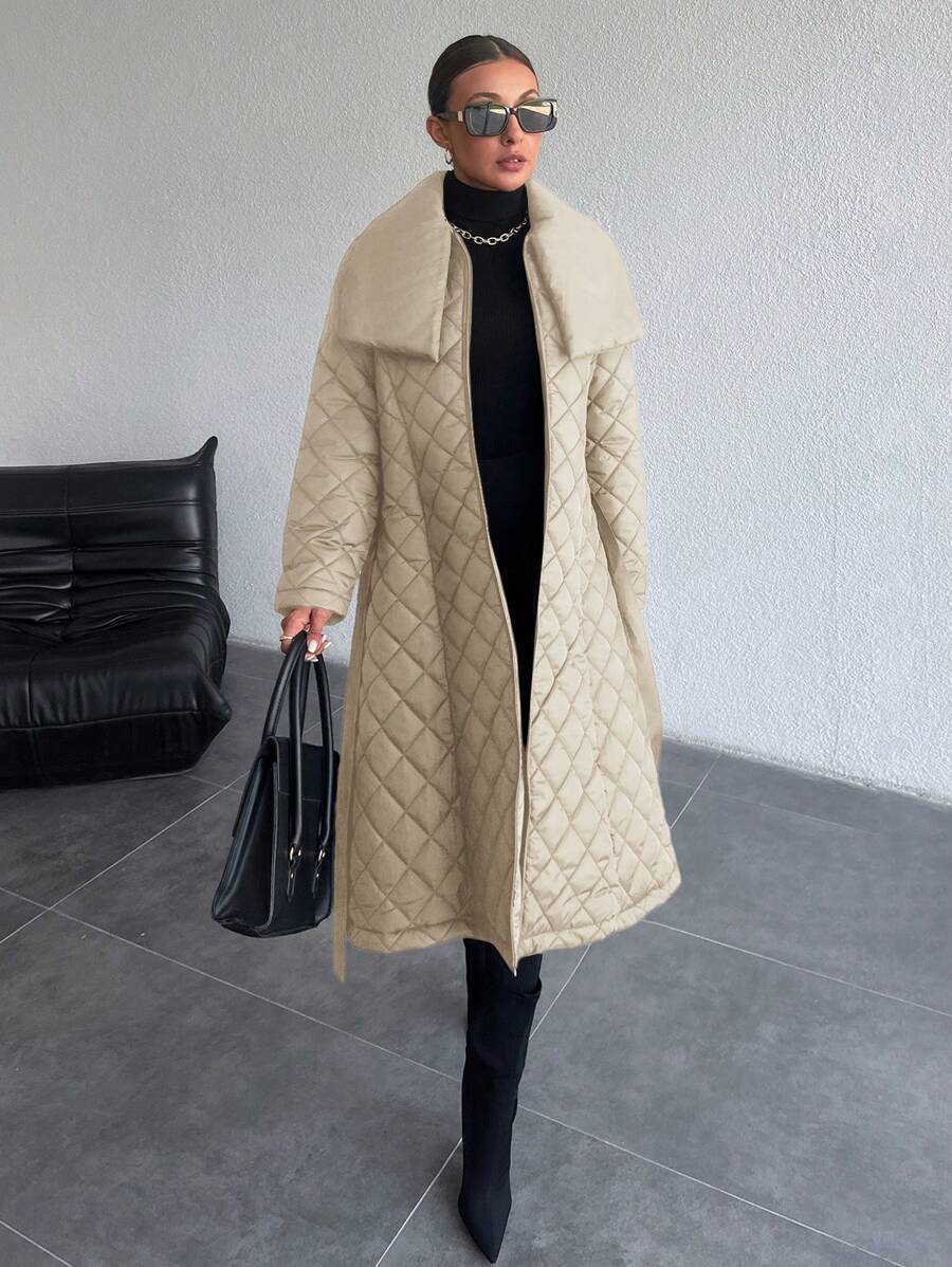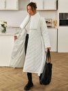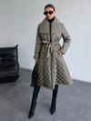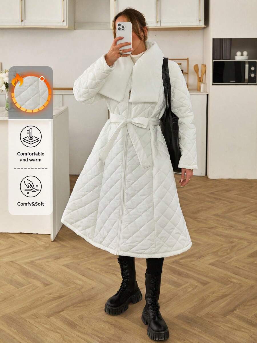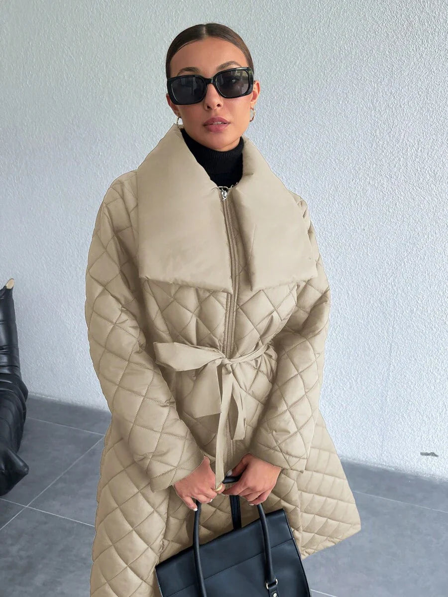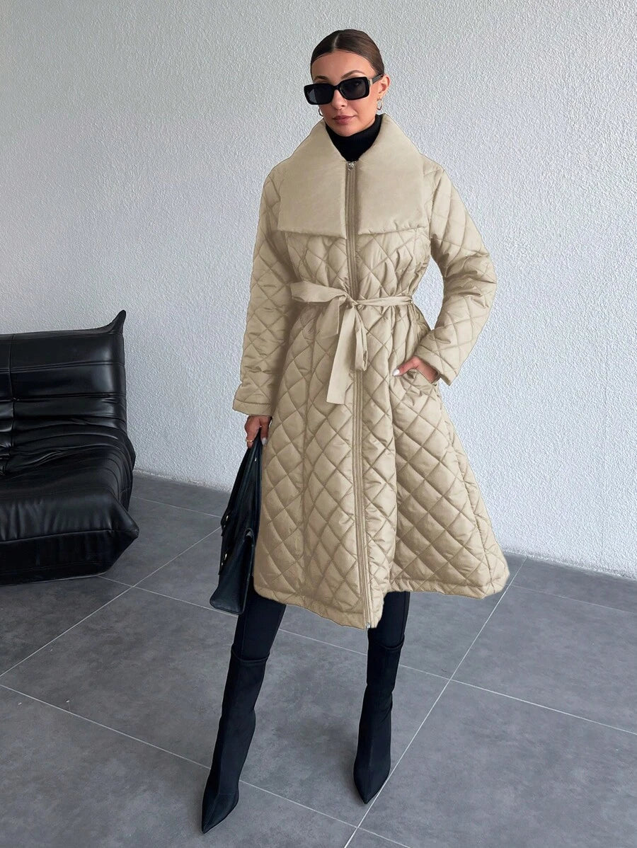 Giacca invernale lunga imbottita con collo sciallato alla francese, cintura e cerniera