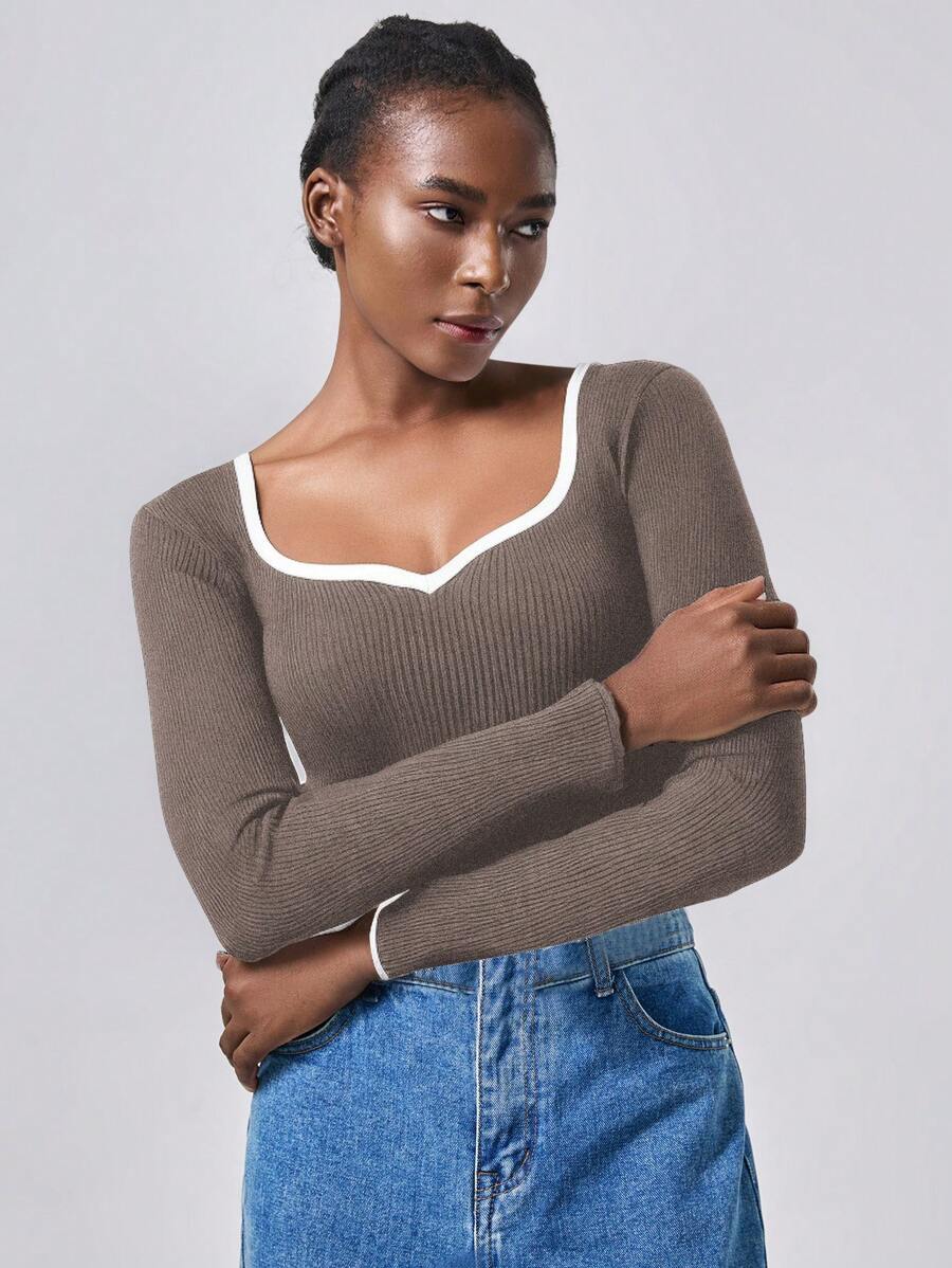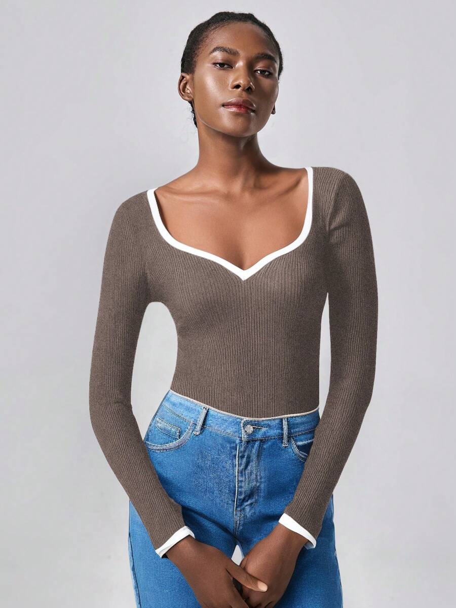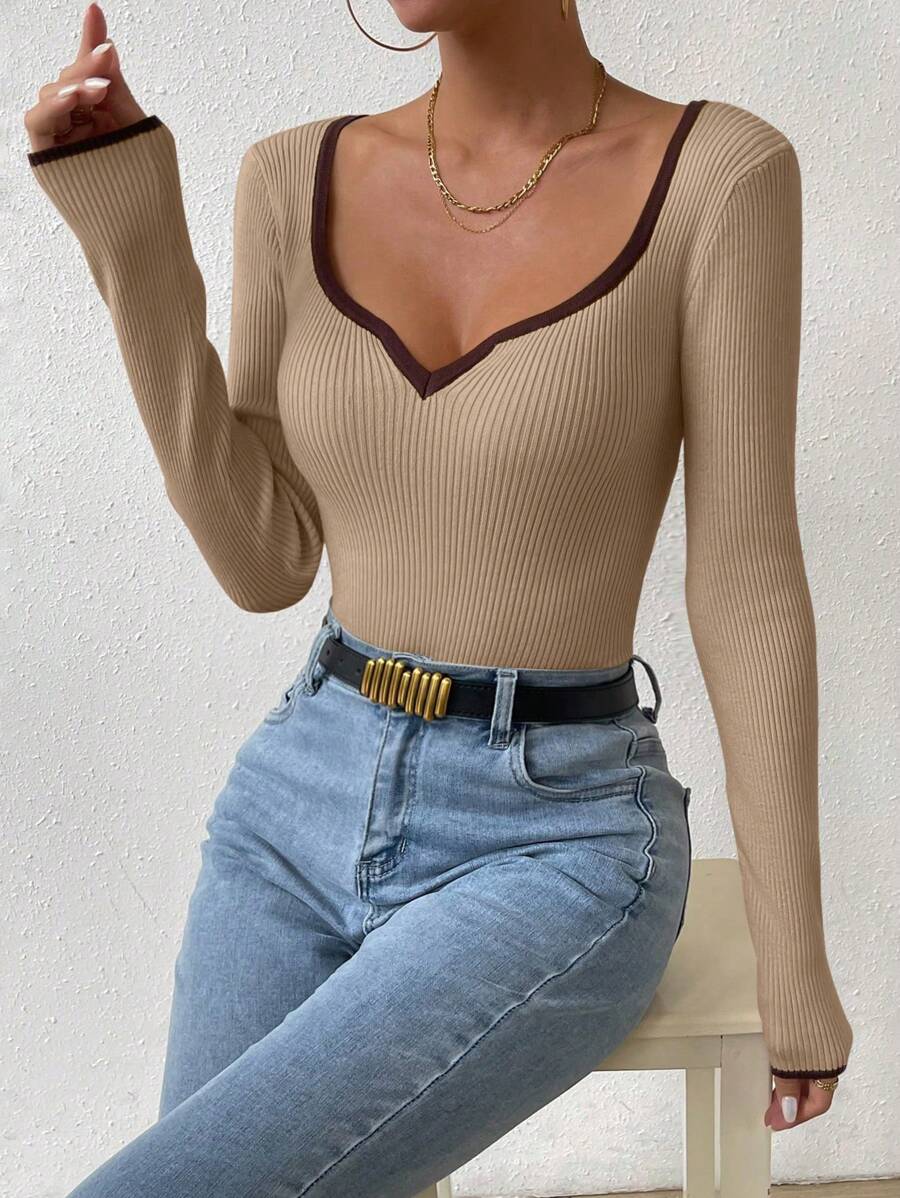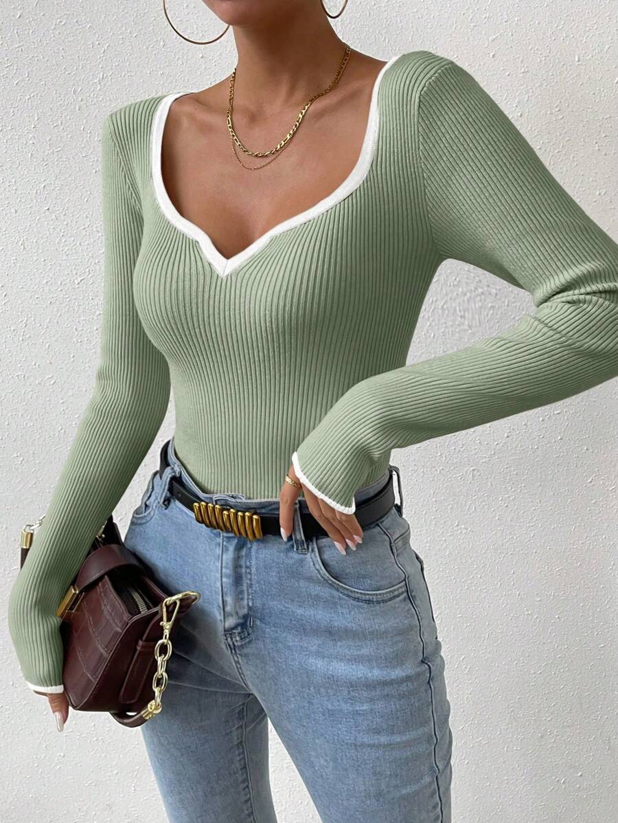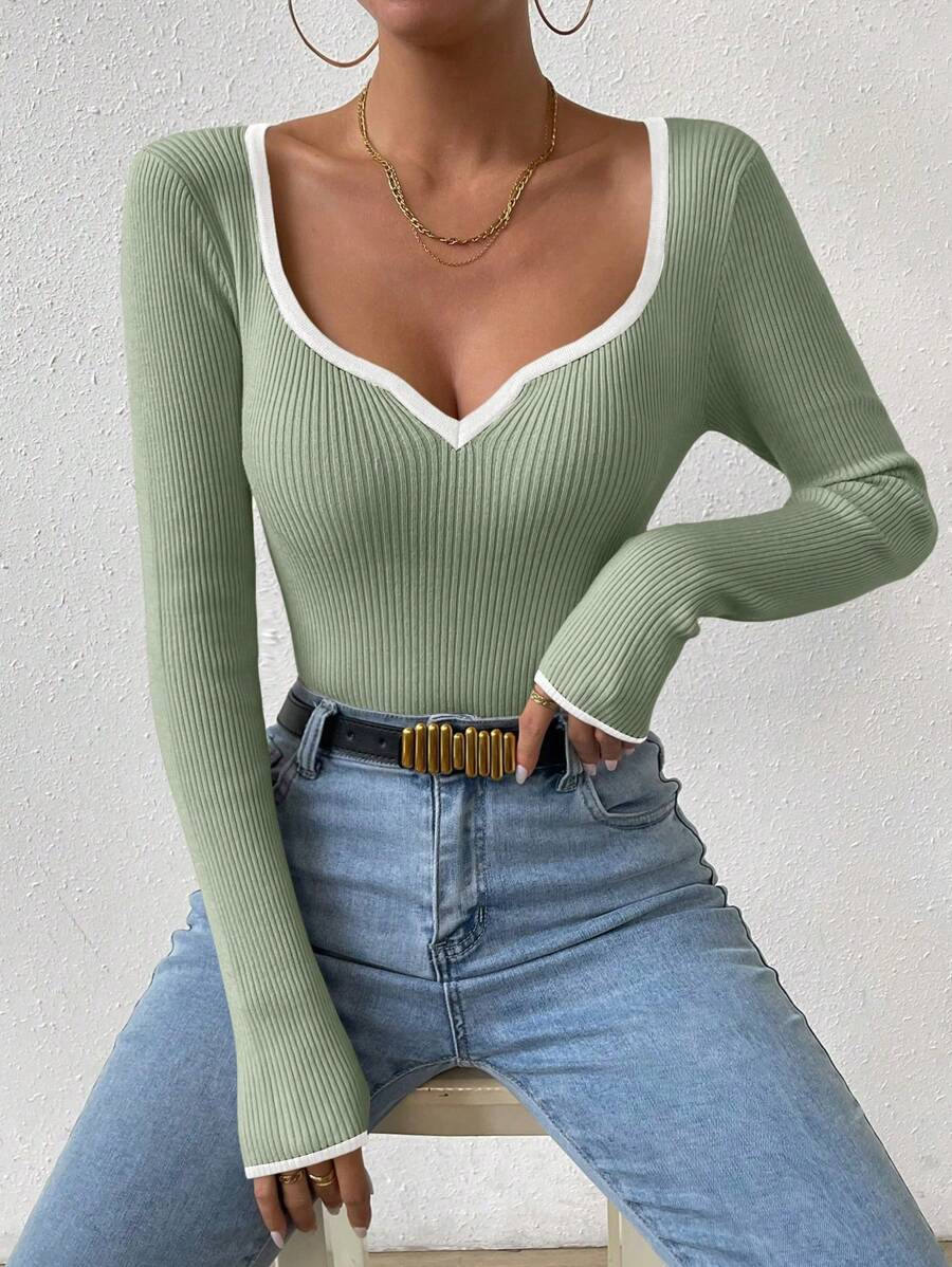 Maglione da donna a costine con scollo a cuore, stile pullover