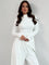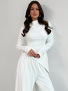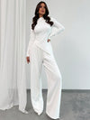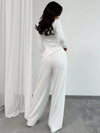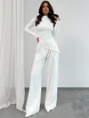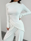 Set elegante con colletto asimmetrico bianco, vita arricciata, maglietta a maniche lunghe con orlo asimmetrico e pantaloni a vita alta
